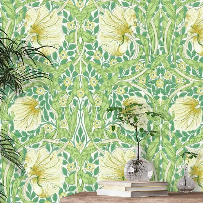 A stunningly beautiful classic Morris style floral trellis with circular shapes and a strong symmetrical pattern within the leaves. Shown in soft shades of green with blue and yellow details – available in other colours. An exclusive colourway, created exclusively on a non-woven paper.