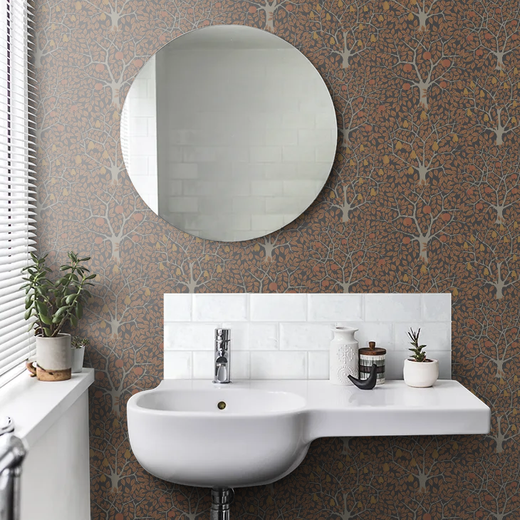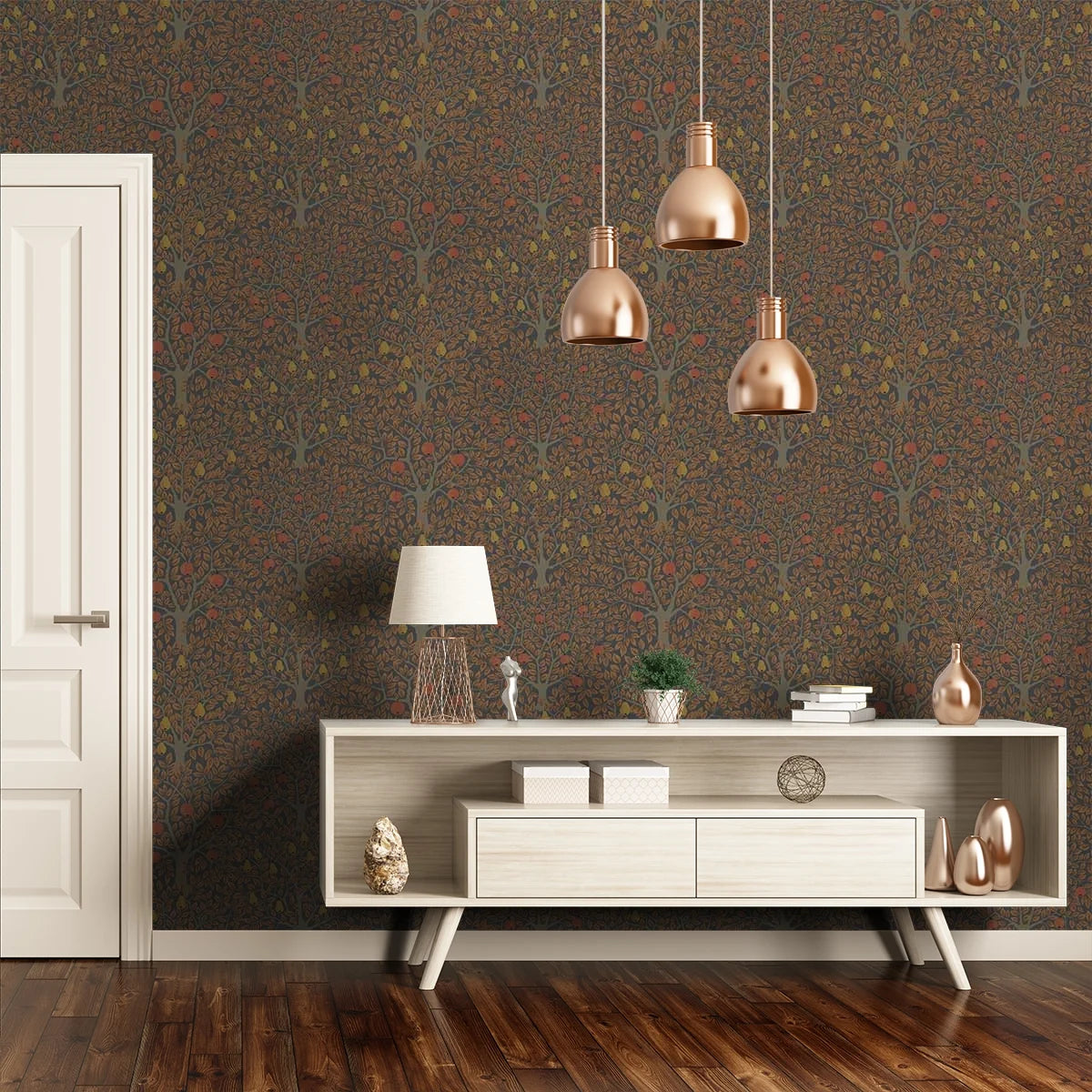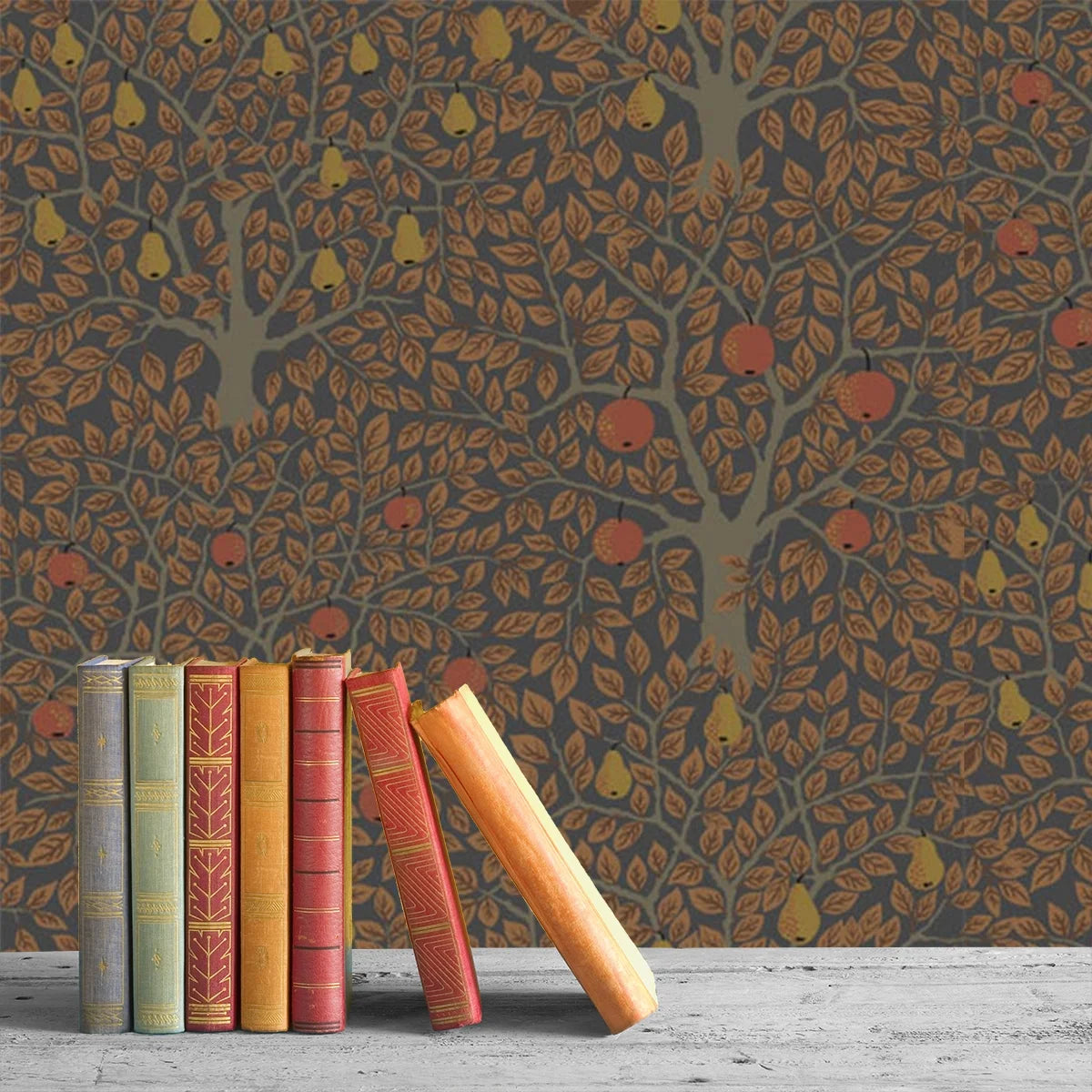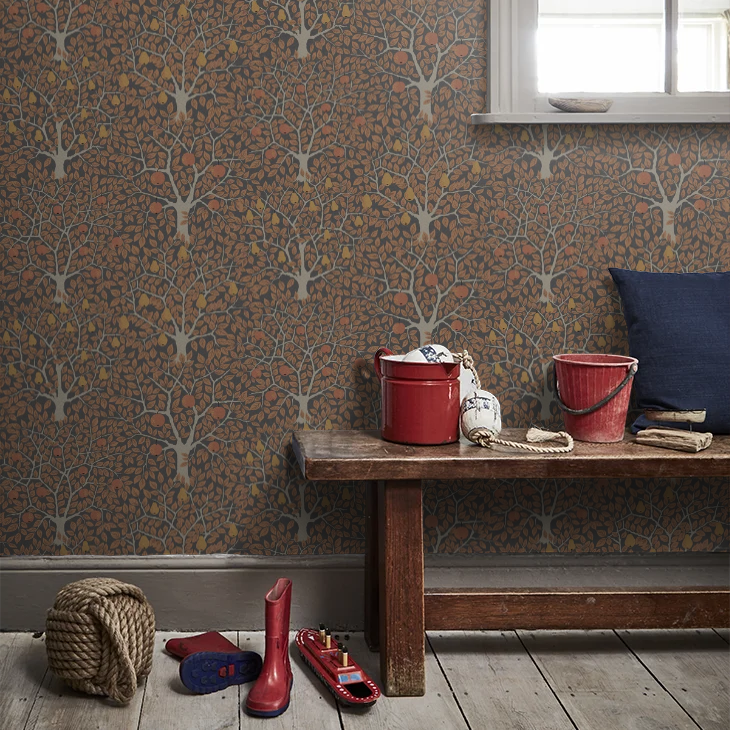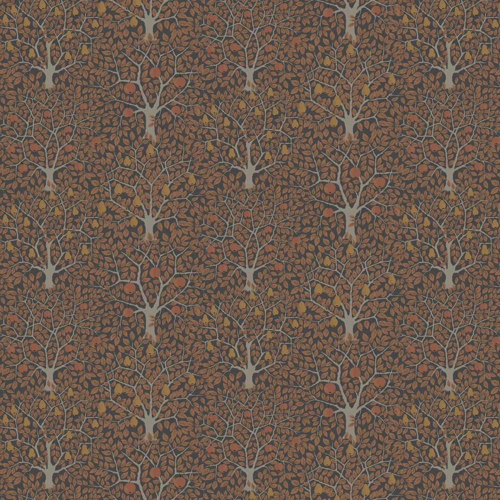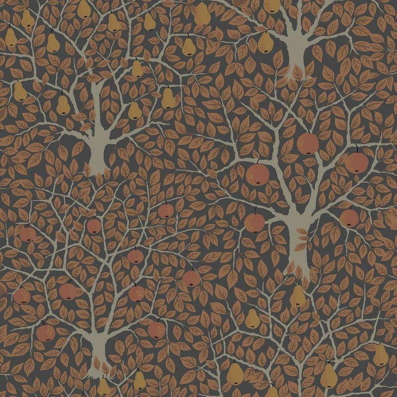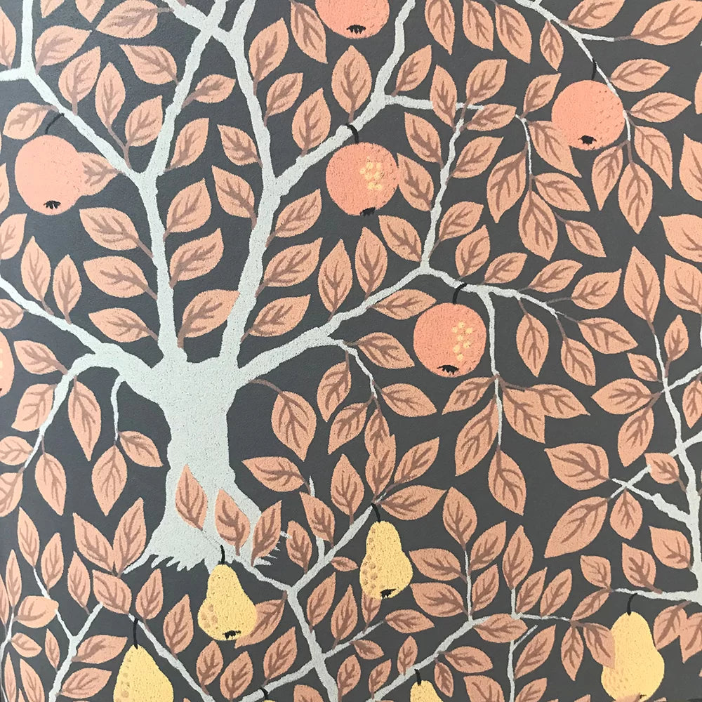 A full orchard of fruit trees in full leaf with oversized apples and pears. Beautifully realised in heritage colours from the Swedish designer Hannah Wendelbo.
