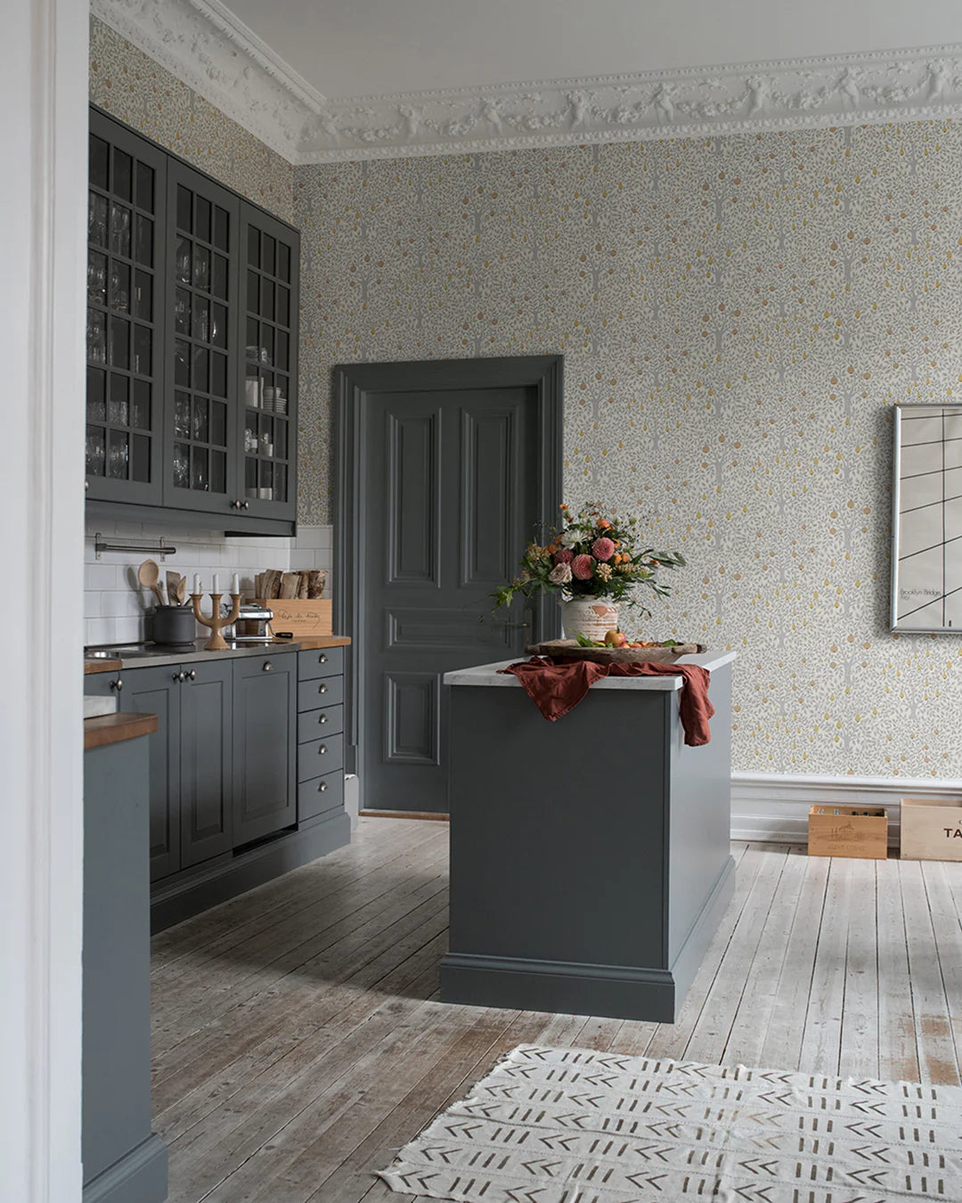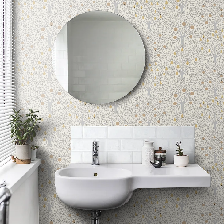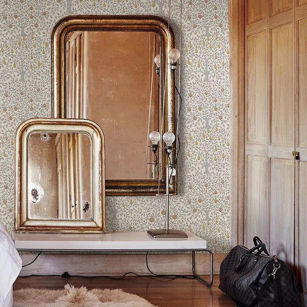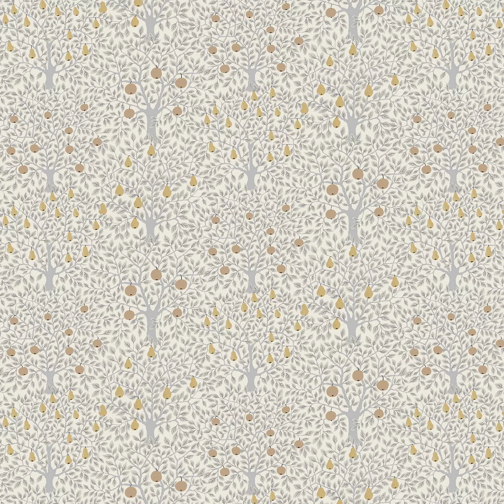 A full orchard of fruit trees in full leaf with oversized apples and pears. Beautifully realised in heritage colours from the Swedish designer Hannah Wendelbo.