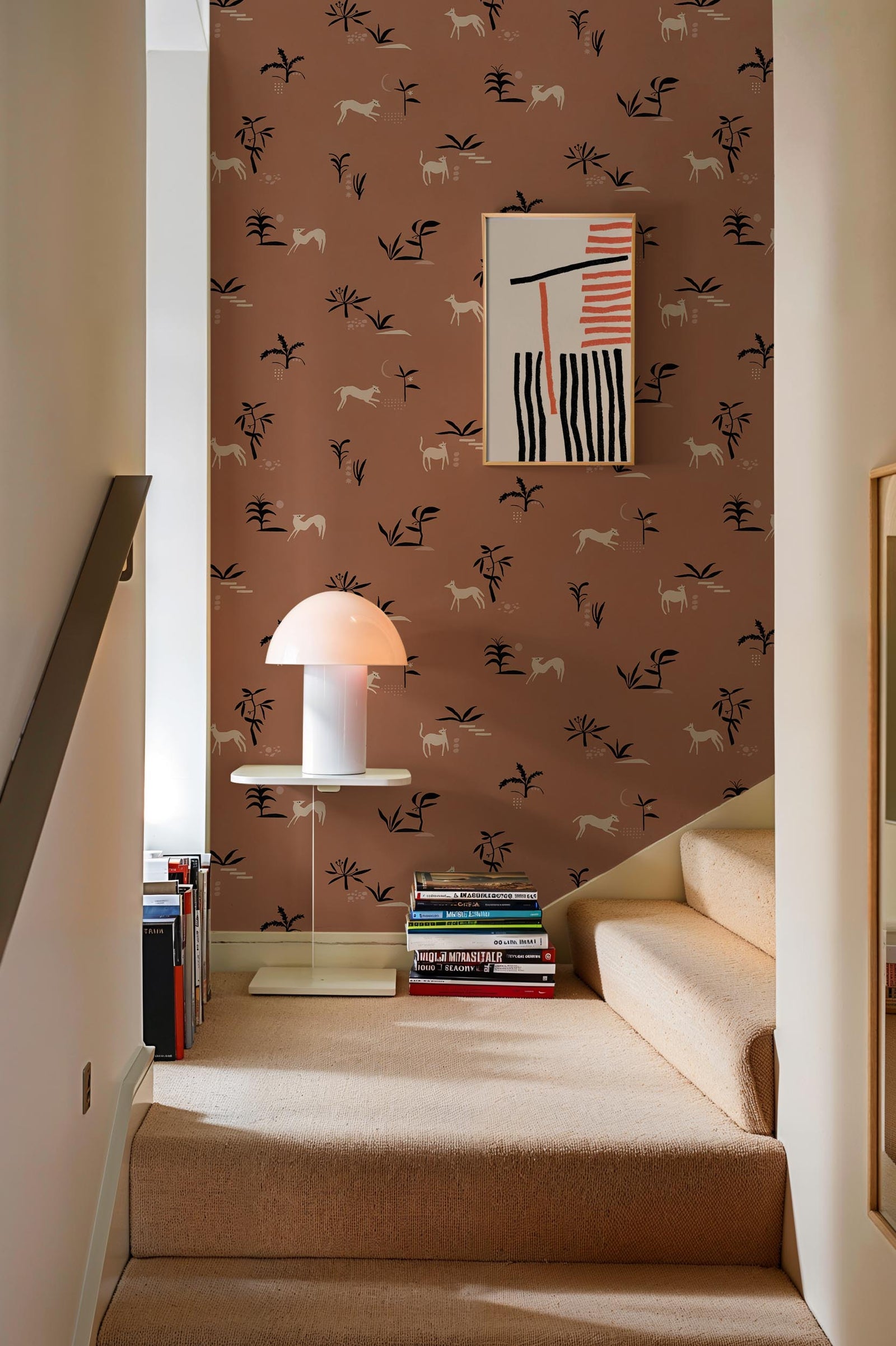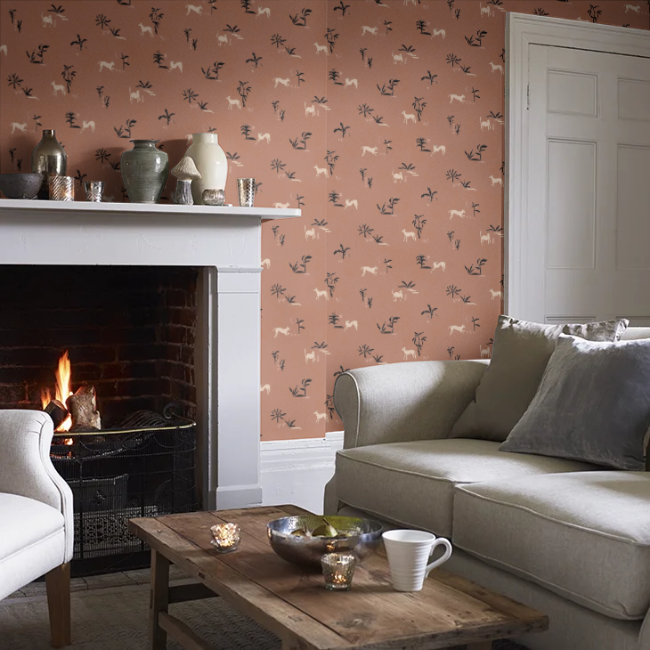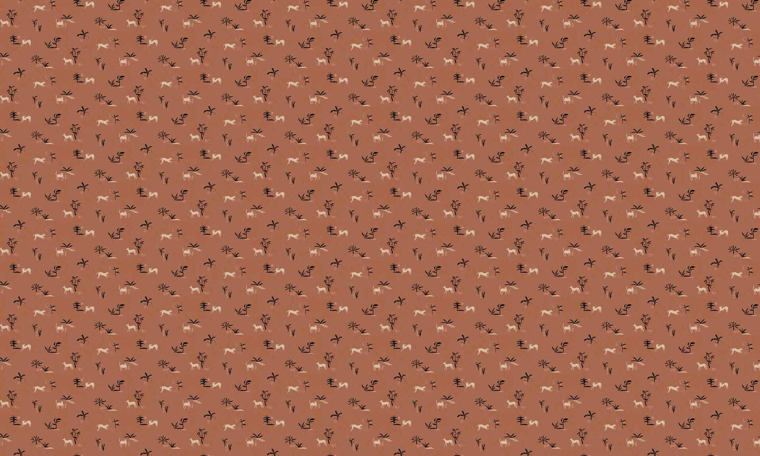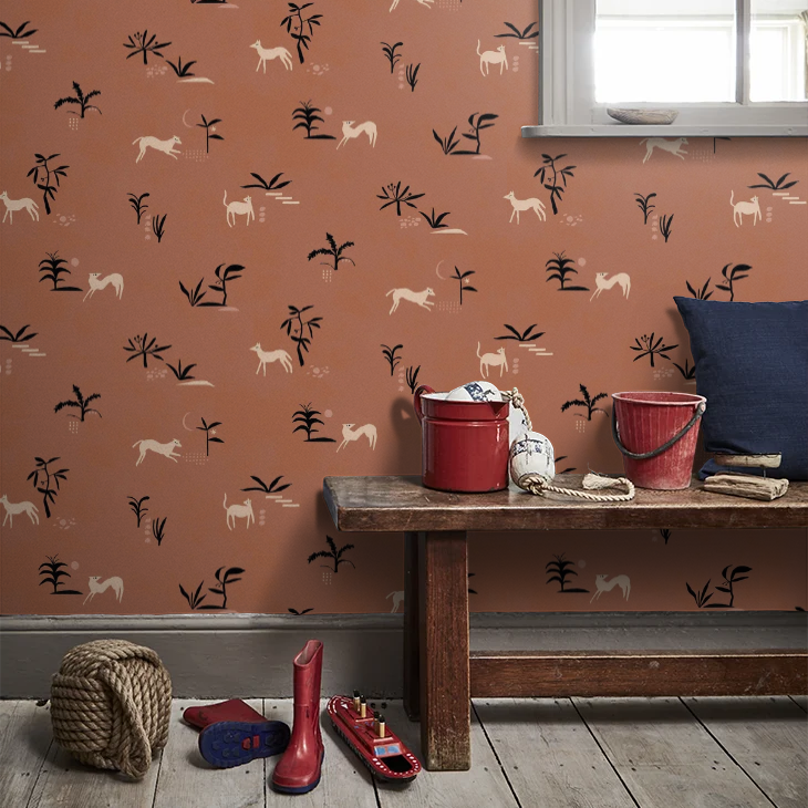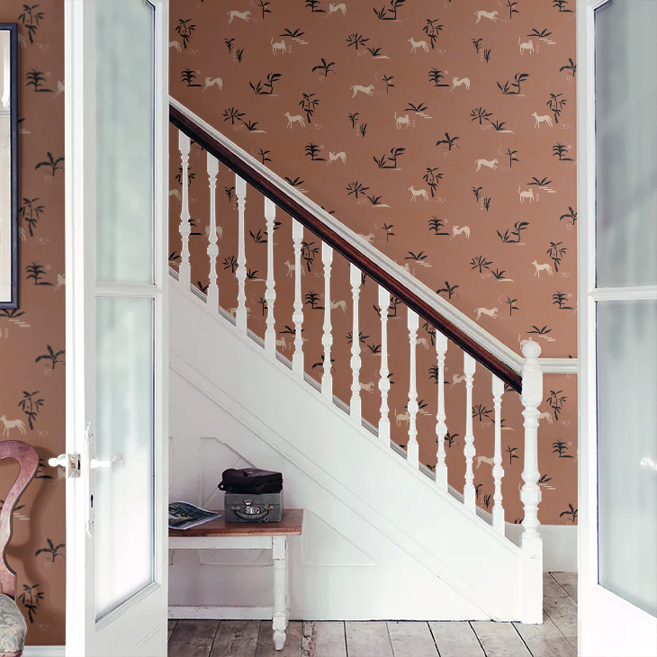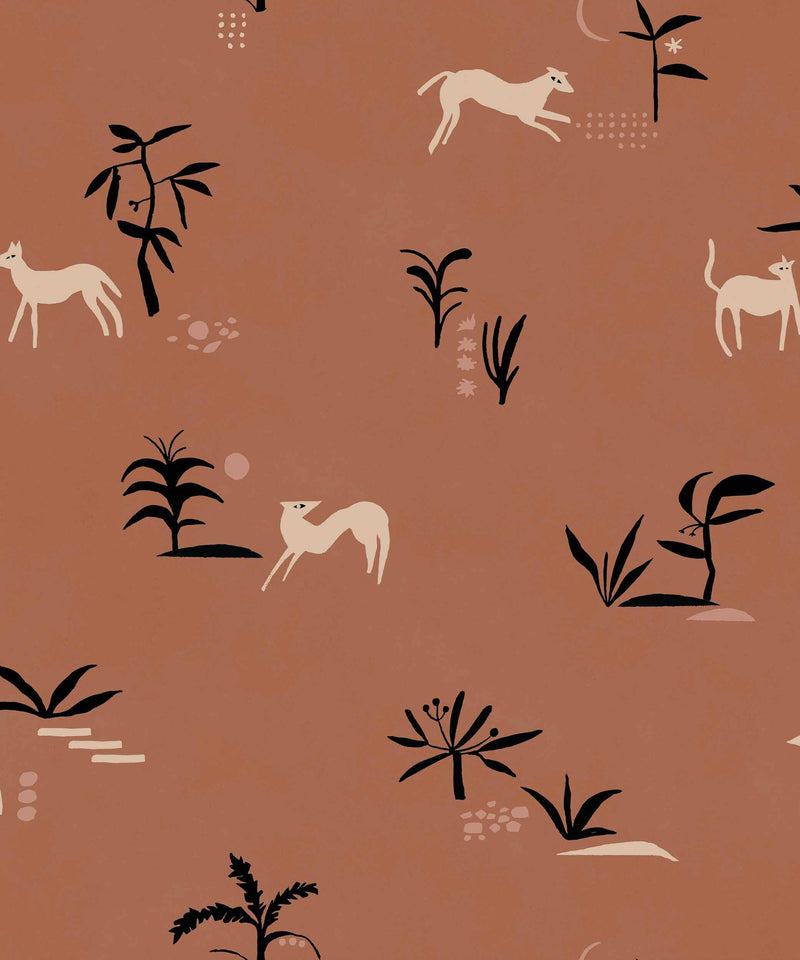 From Spain Prehistoric Animal wallpaper is a lightly textured wallcovering inspired by traditional cave paintings, a graphic motif featuring trees and animals in a contrasting colour palette. Seen here in the Ocher colourway.