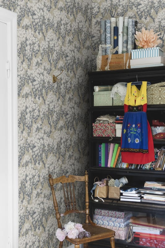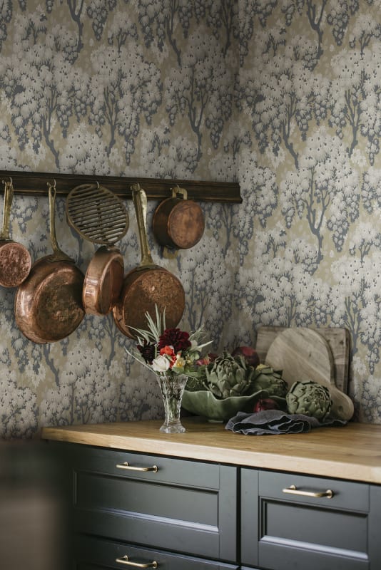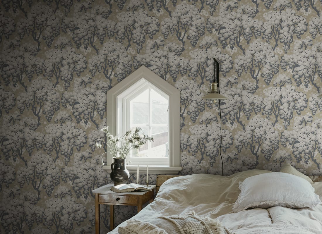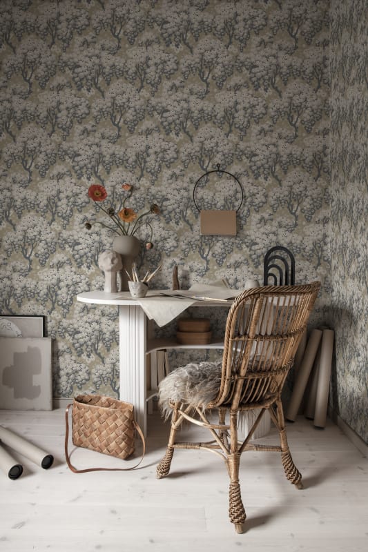 Likened to simply existing within the dancing crowns of the linden trees and their floral bed. This wallpaper from our archives is available in three new colourways. The detailed patterns of foliage and tiny daisies are interwoven to create an uplifting sense of gentle, cloudy skies.Designed by Från ett 1920-talsoriginal