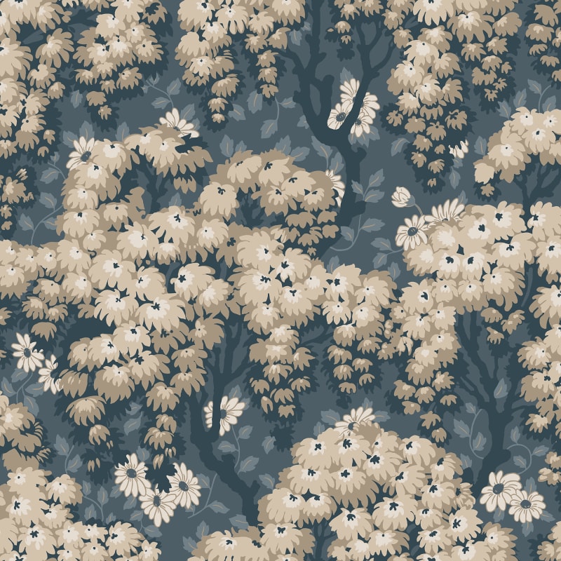Lush tree canopies against a meadow of daisies create a harmonious, large-patterned curtain on the wall. The detailed patterns of foliage and tiny daisies are interwoven to create an uplifting sense of gentle, cloudy skies. Based on an older original from the early 1900s. Ragnvi, Midnight Blue, has a deep blue base and leafage in pleasant shades of beige and brown.Designed by Studio Sandberg
