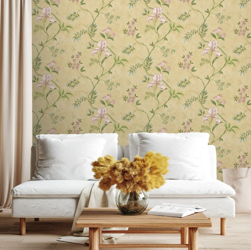 Vibrant and trailing iris flowers against a muted texture effect background; adorning this design with a touch of nature.