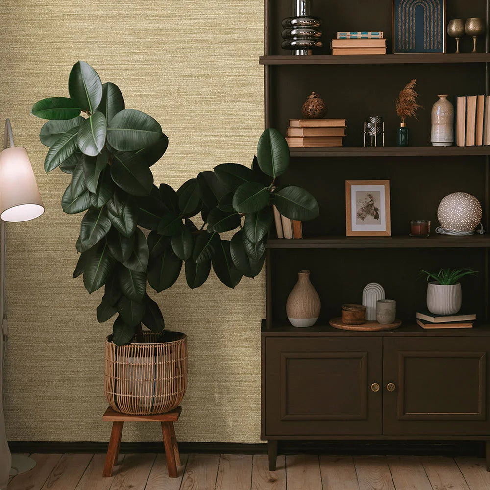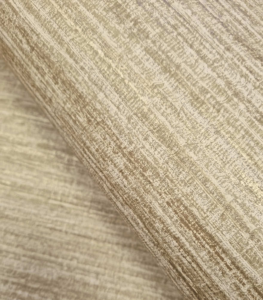 This wallpaper appears as if it was intricately crafted and handwoven with slight variations, that lend an artisanal feel to the overall design. The subtle metallic qualities appear to be woven seamlessly into the tactile surface. PVC-Free textured wallcovering.