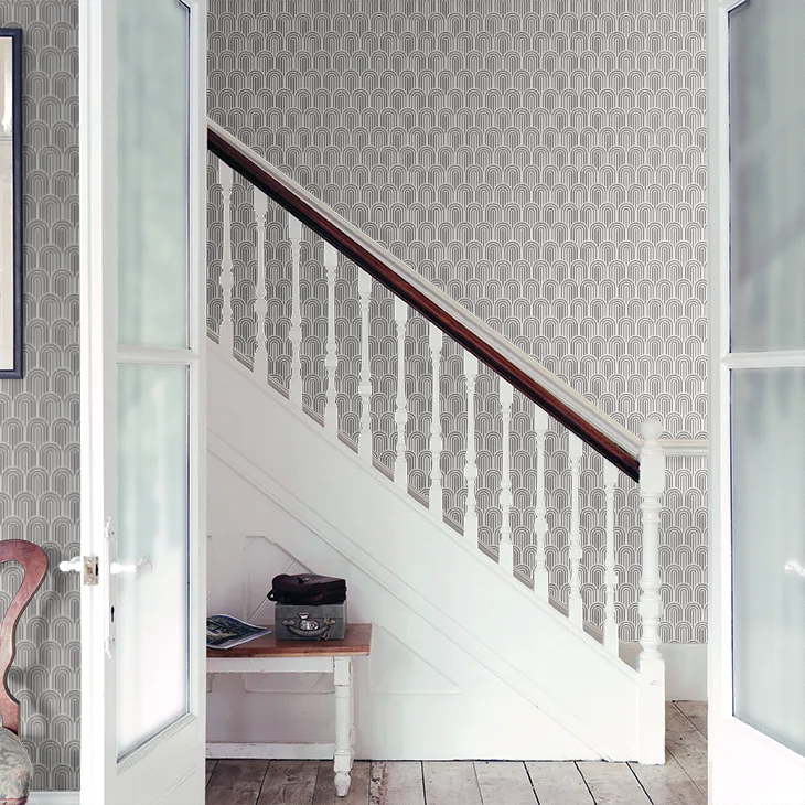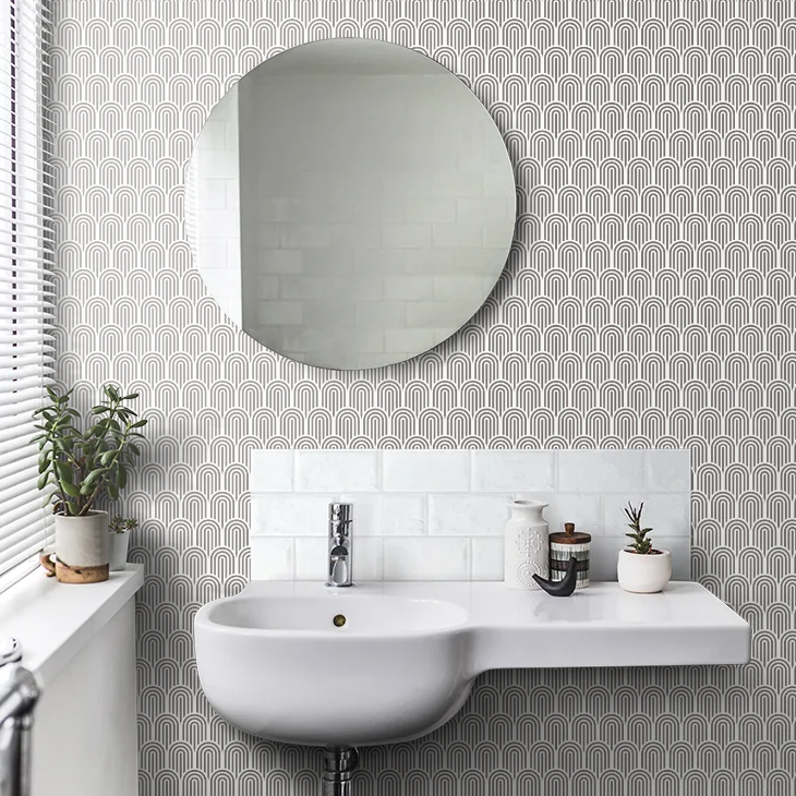 Simple arches repeat across the design in this modern take on an art deco inspired design. The perfect balance of quirky yet contemporary, this design is bound to introduce a joyful lift to any space.