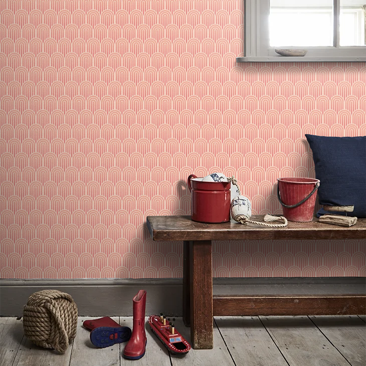 Simple arches repeat across the design in this modern take on an art deco inspired design. The perfect balance of quirky yet contemporary, this design is bound to introduce a joyful lift to any space.