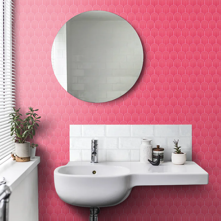Simple arches repeat across the design in this modern take on an art deco inspired design. The perfect balance of quirky yet contemporary, this design is bound to introduce a joyful lift to any space.