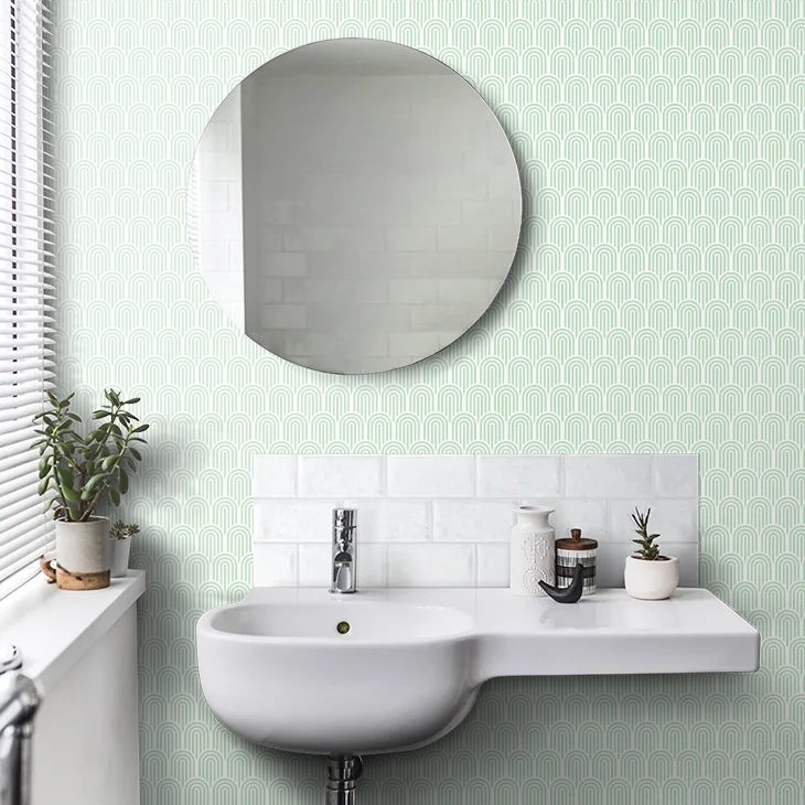 Simple arches repeat across the design in this modern take on an art deco inspired design. The perfect balance of quirky yet contemporary, this design is bound to introduce a joyful lift to any space.