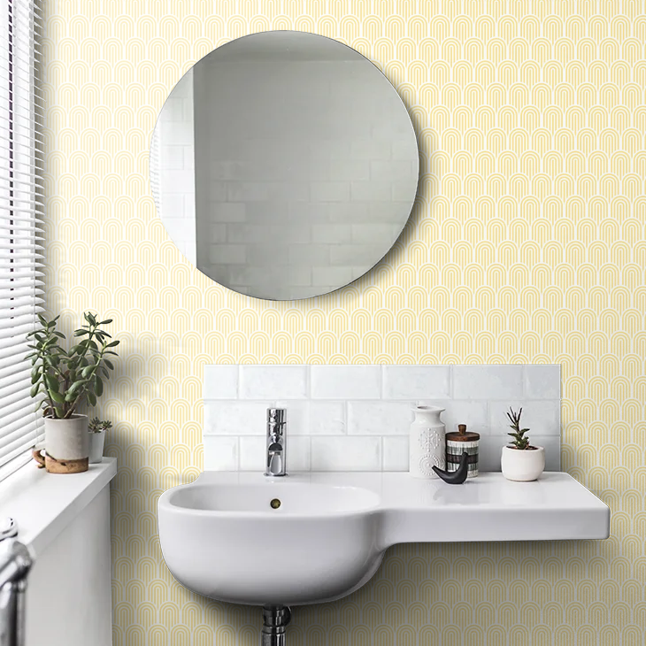 Simple arches repeat across the design in this modern take on an art deco inspired design. The perfect balance of quirky yet contemporary, this design is bound to introduce a joyful lift to any space.