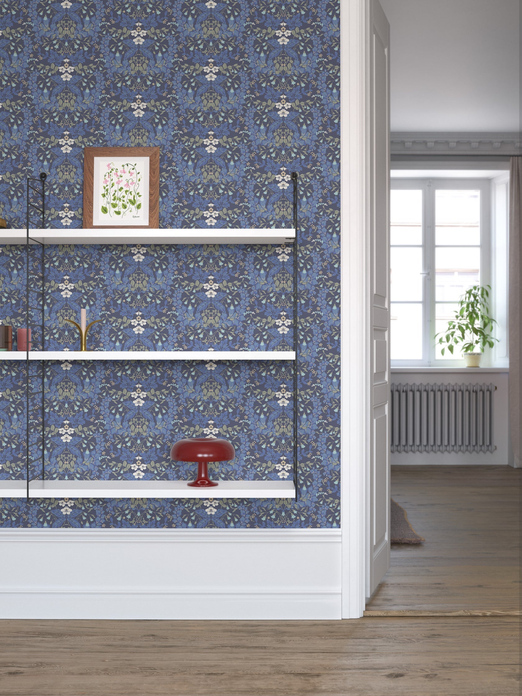 In the wallpaper pattern Saga, the forest's plants are brought to life. The wildflowers of the deep forest are often small, but they shine like stars in the moss. Here, the delicate twinflower winds its way—the heart of the entire collection—surrounded by wintergreen and chickweed wintergreen. The Saga pattern is available in three colorways.