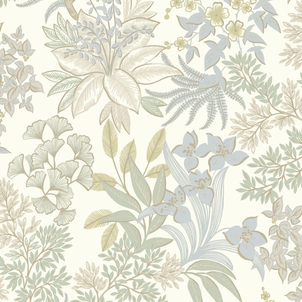 A vibrant nature filled scene featuring trees, flowers and lush foliage beautifully intertwined in full bloom. Delicate metallic highlights subtly enhance the details, adding a touch of elegance and depth. The combination of rich botanical elements with a hint of shimmer brings life and sophistication to any space.