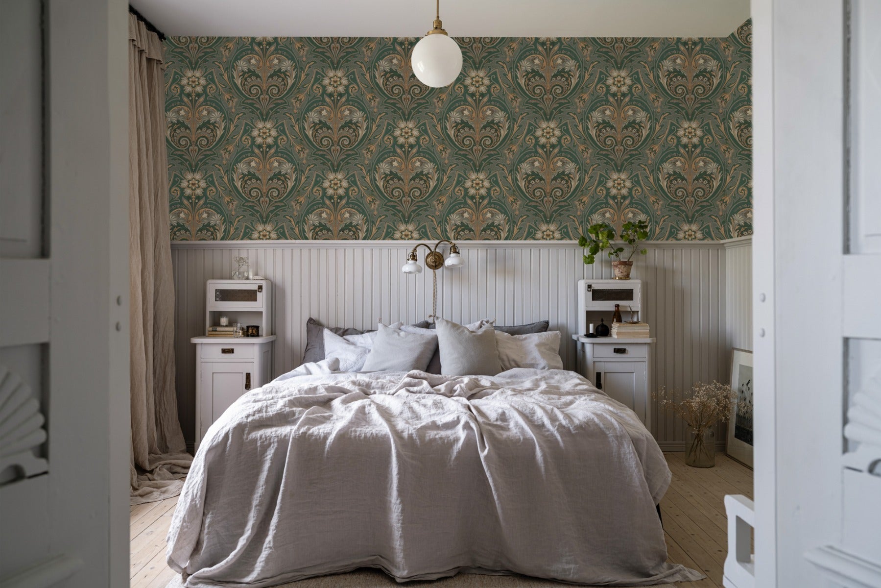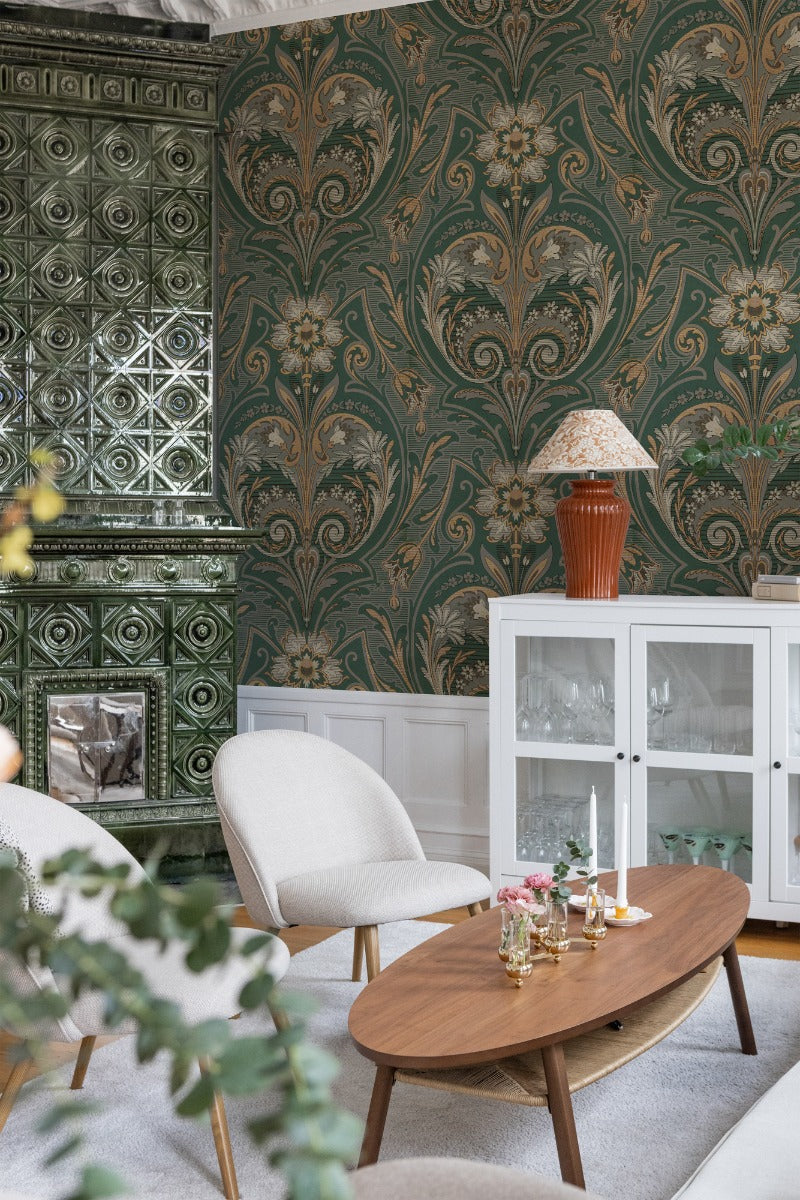 The Design: A wallpaper with roots in the elegant salons of the 19th century, Oscar Antique Medallion revives the classic medallion pattern typical of the manor-like interiors of the time. The symmetrical ornaments and delicately drawn floral details evoke a sense of romance and bring a genuine historical character to the room.