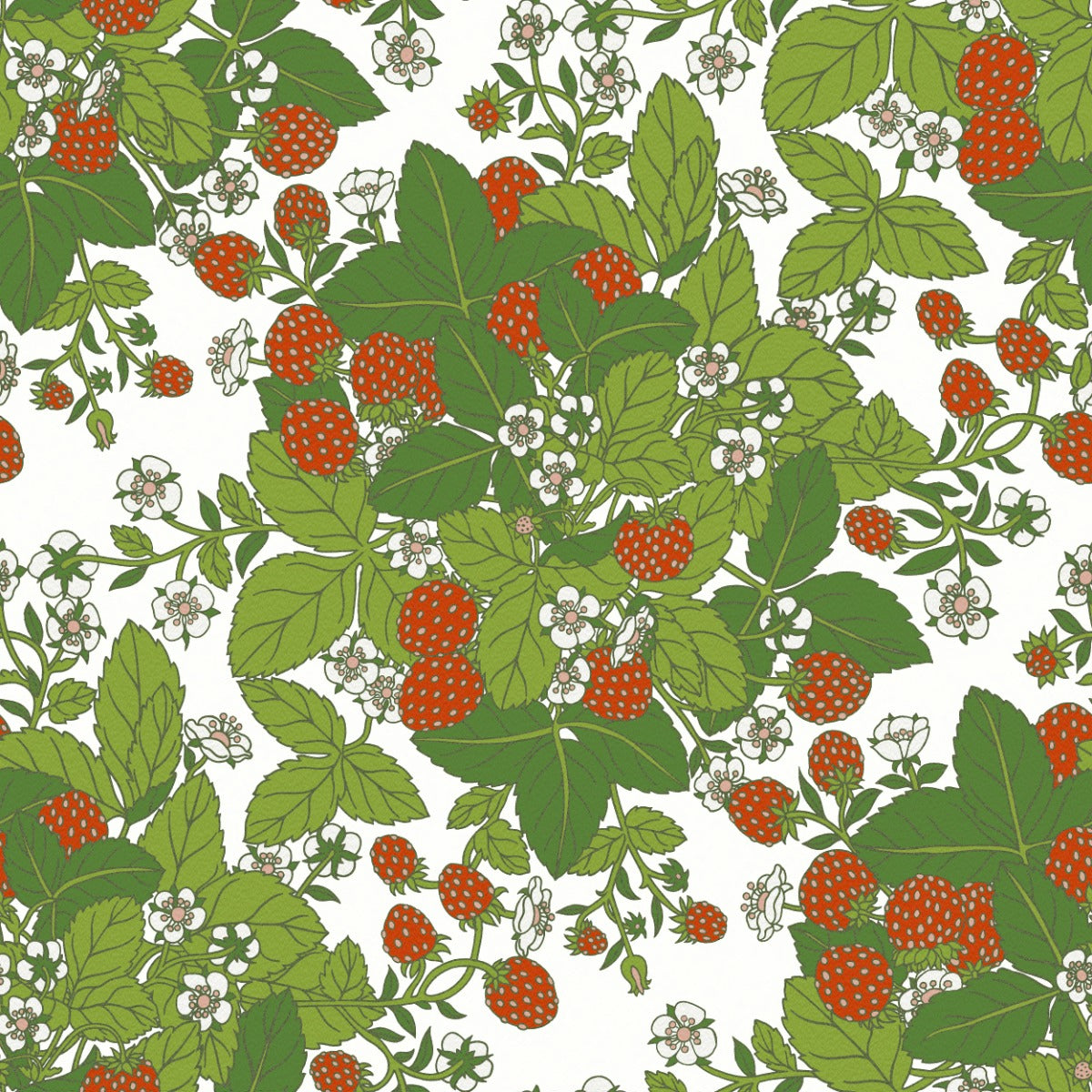 The Design: The Strawberries pattern was created by illustrator Gunnel Ginsburg in the 1970s. With its playful take on summer’s favorite berry, it quickly became a beloved classic. Now, this charming design returns in a new, larger format as a mural wallpaper in the Atelier collection.