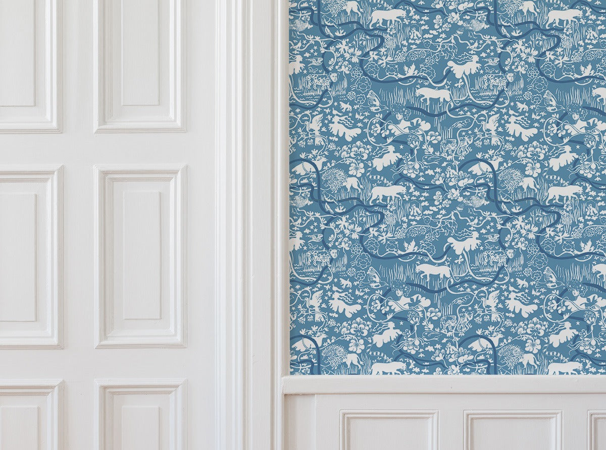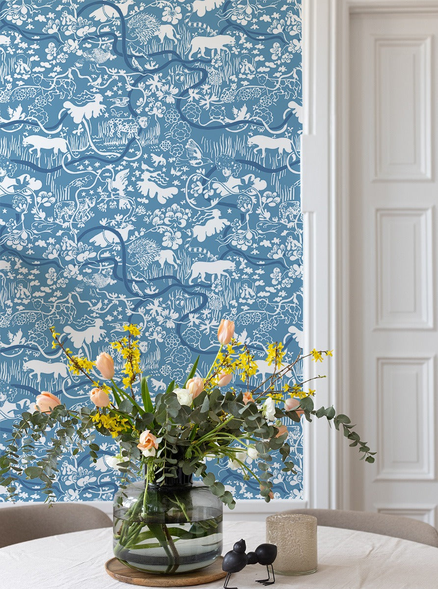 The Design: Vines is an iconic pattern designed by Sven Fristedt for Duro in the 1970s – now reissued in new, updated colorways. The distinctive design language is typical of its era: bold, organic, and full of movement. Drawing inspiration from both the lush greenery of the jungle and the graphic aesthetics of the time,Vintes is a vibrant pattern where stylized plant forms, along with imaginative animals and people, spread across the wall in a rhythmic flow. The result is a wallpaper with a strong presence – a confident choice for anyone looking to enhance a space with color, pattern, and a true 1970s vibe.