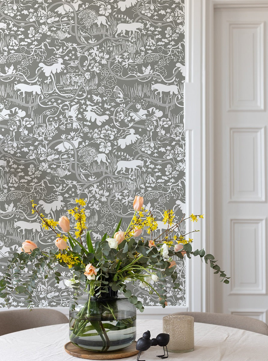 The Design: Vines is an iconic pattern designed by Sven Fristedt for Duro in the 1970s – now reissued in new, updated colorways. The distinctive design language is typical of its era: bold, organic, and full of movement. Drawing inspiration from both the lush greenery of the jungle and the graphic aesthetics of the time,Vintes is a vibrant pattern where stylized plant forms, along with imaginative animals and people, spread across the wall in a rhythmic flow. The result is a wallpaper with a strong presence – a confident choice for anyone looking to enhance a space with color, pattern, and a true 1970s vibe.