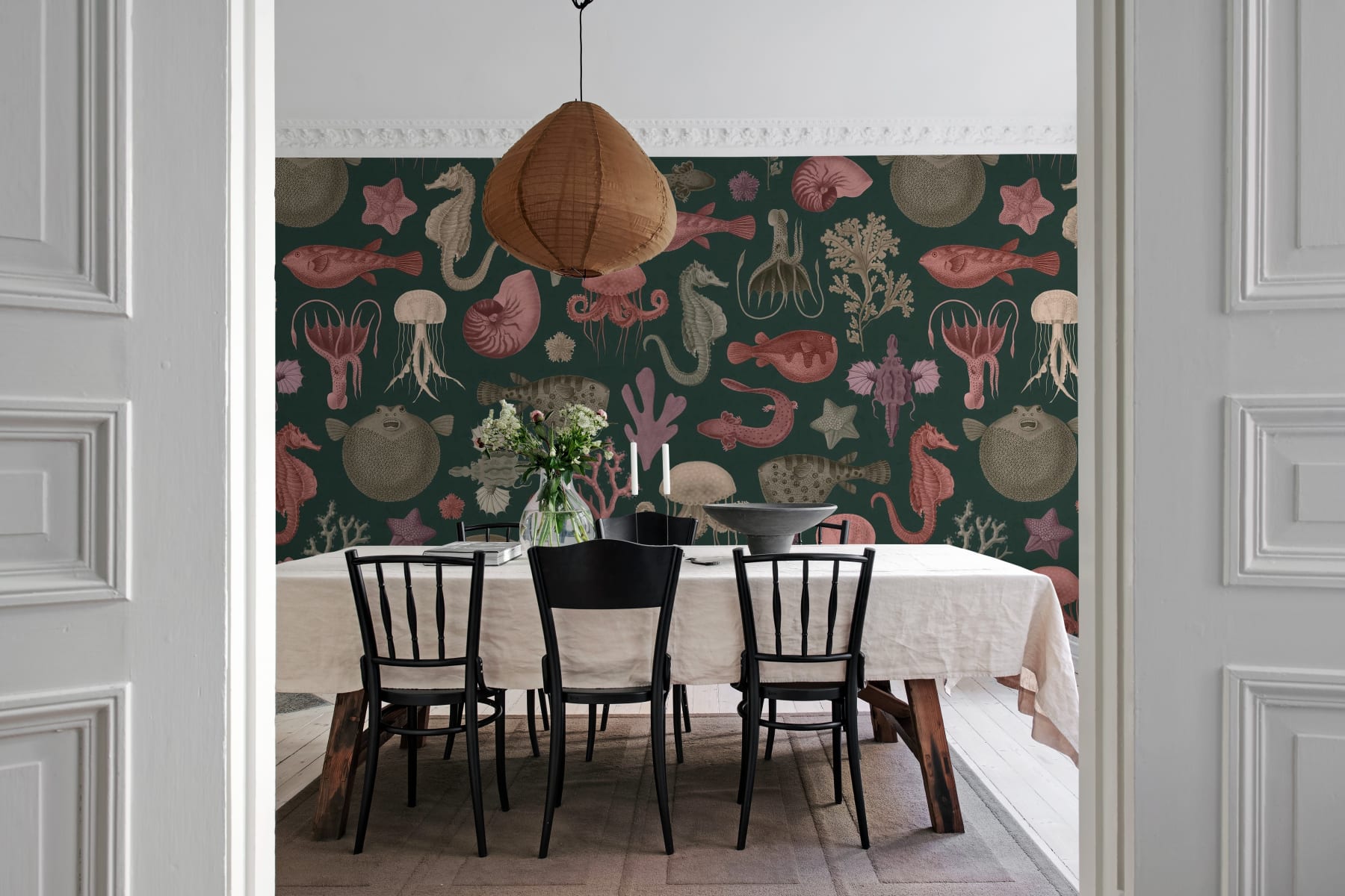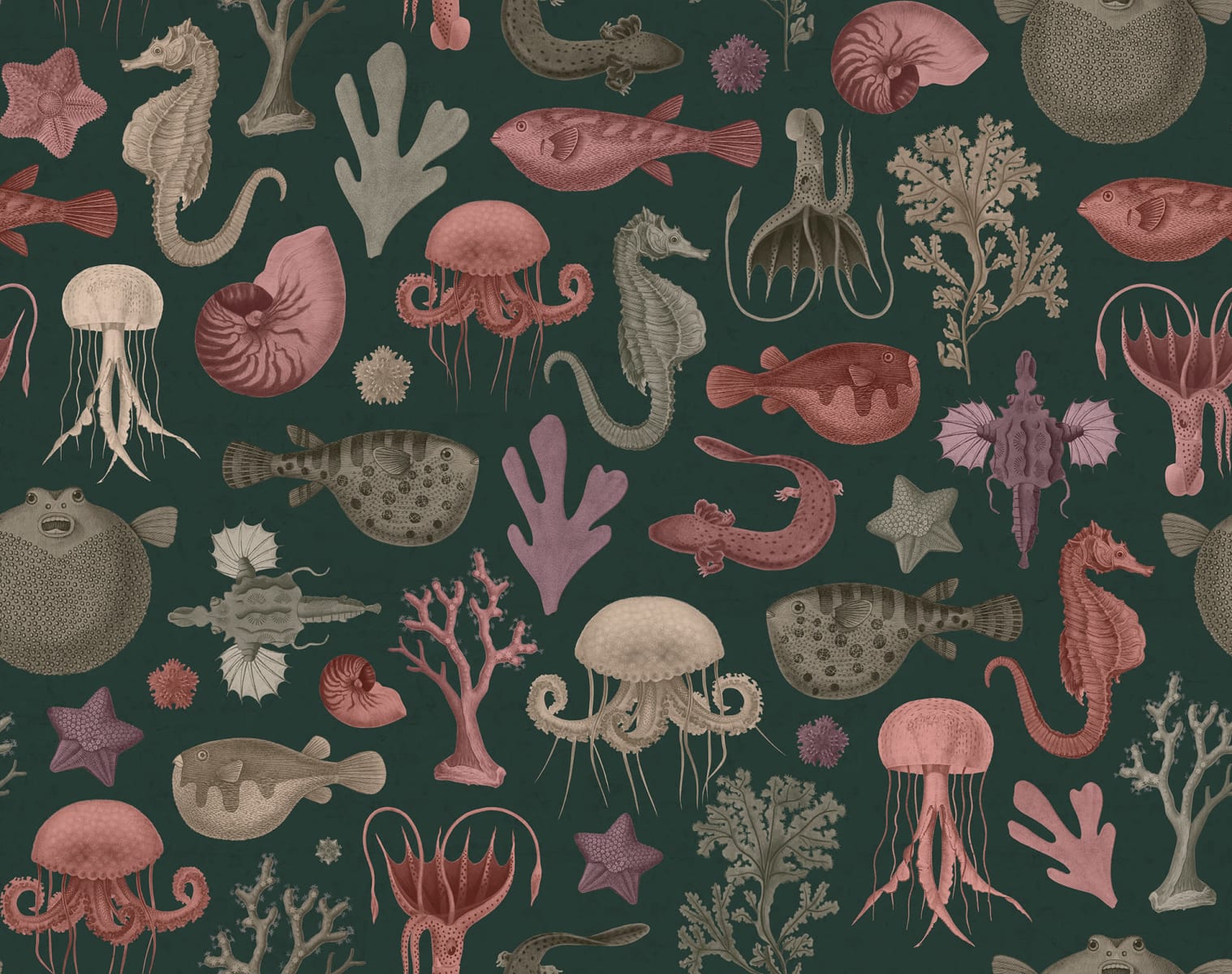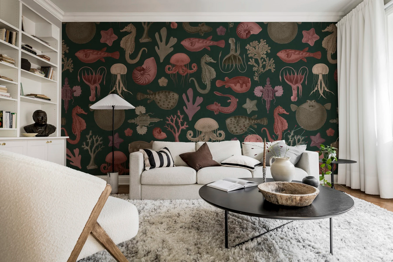 Each panel of this wallpaper is carefully crafted to capture the intricate details of marine creatures, from the graceful movements of fishes to the delicate patterns on seashells mimicking lifelike illustrations that will transport you to a world brimming with awe and wonder, where every glance reveals a new hidden treasure.Click on the images for a closer look.