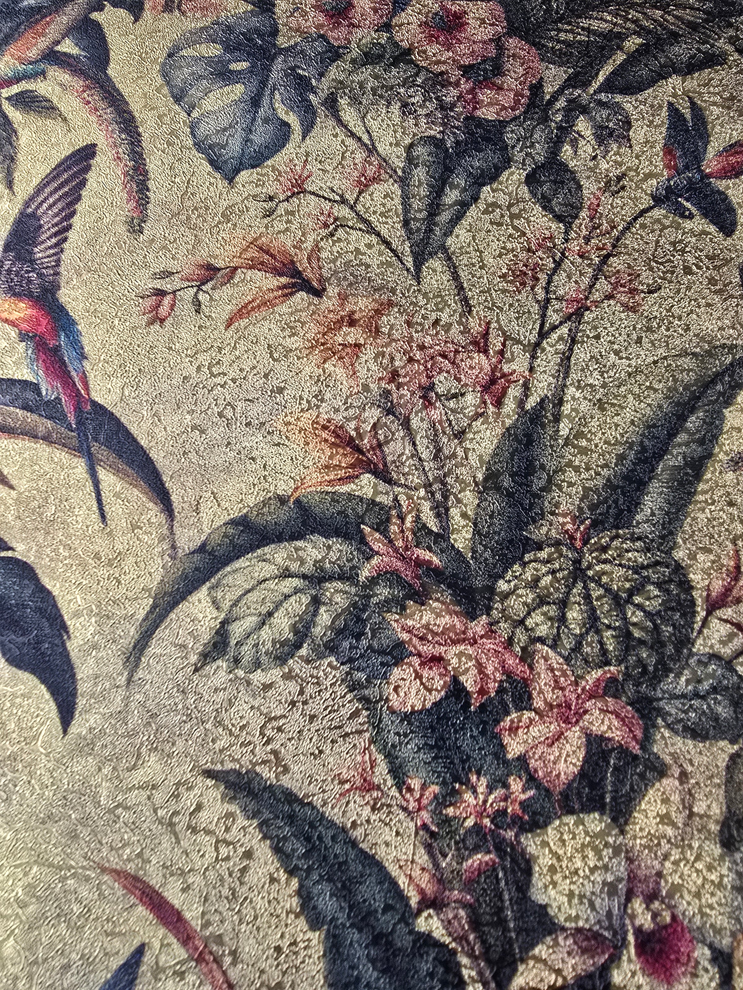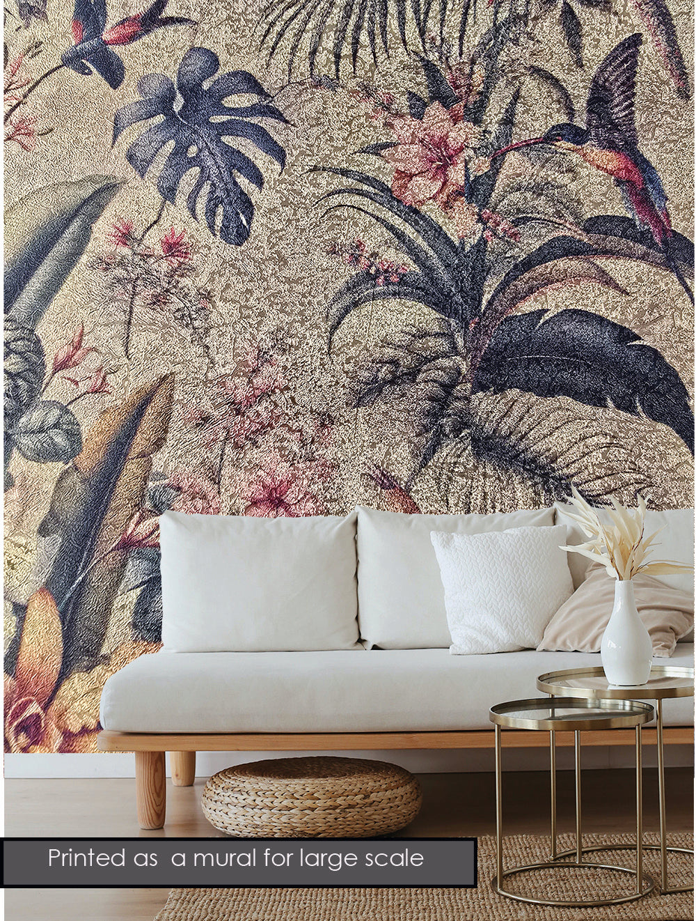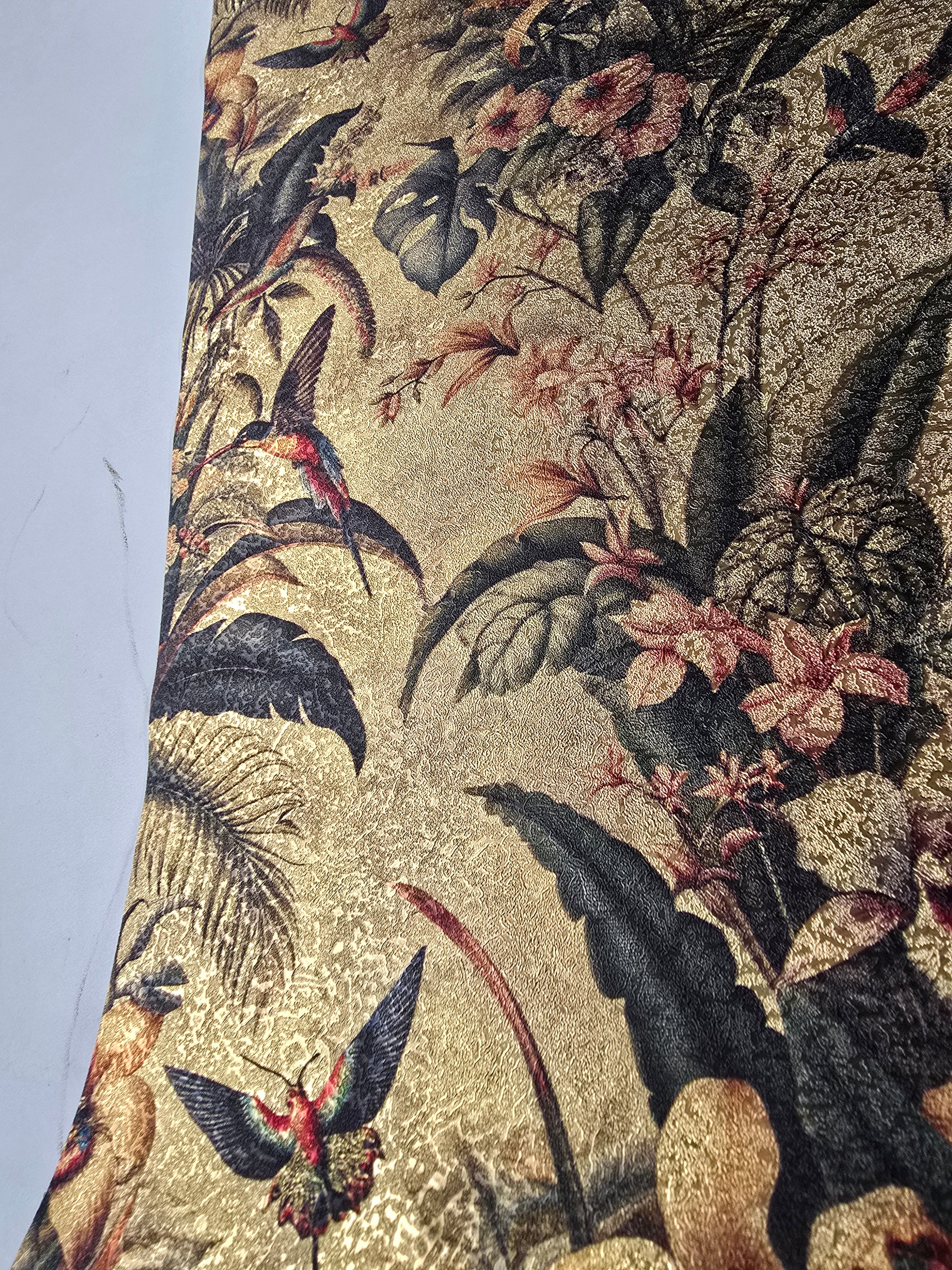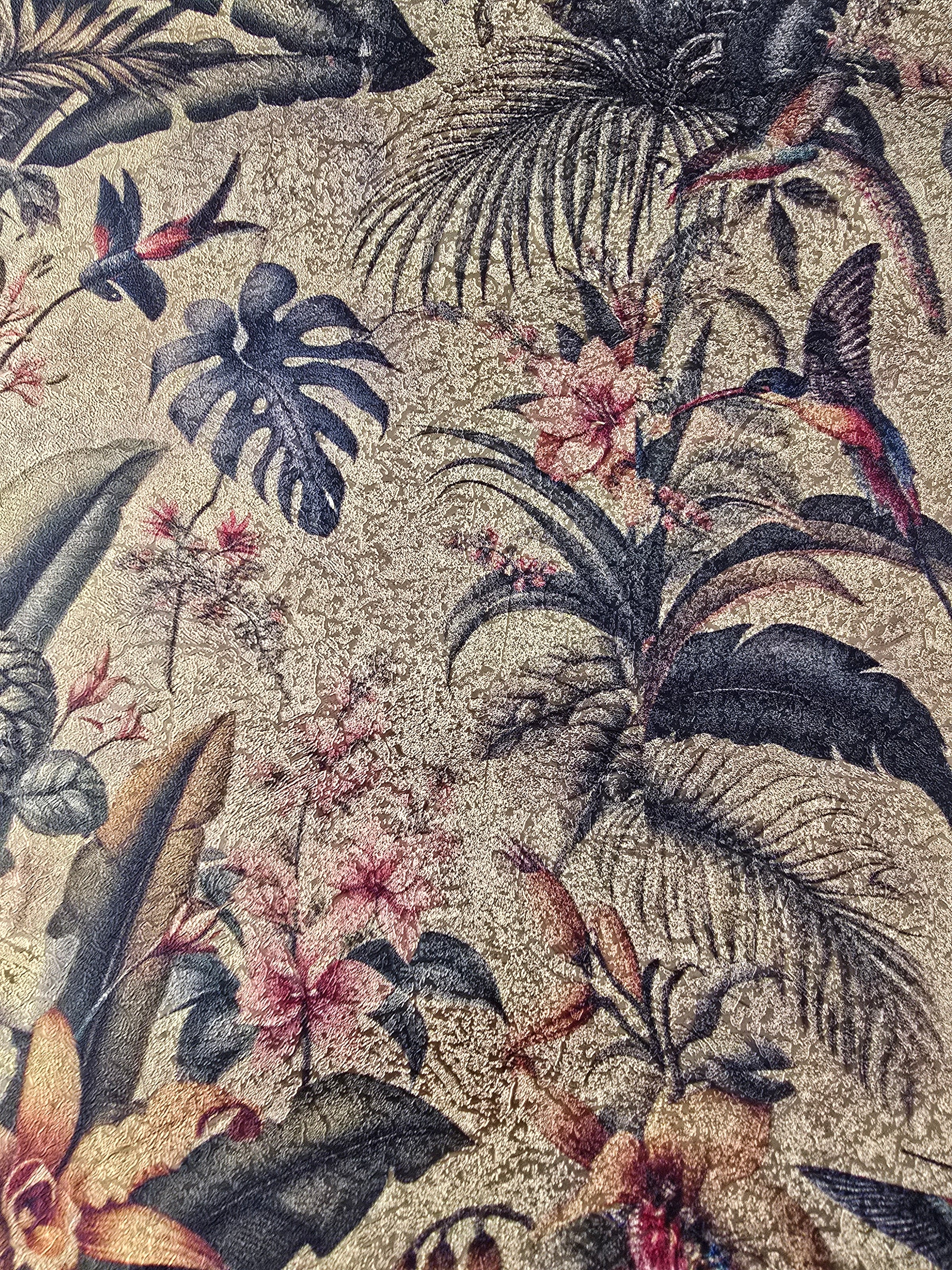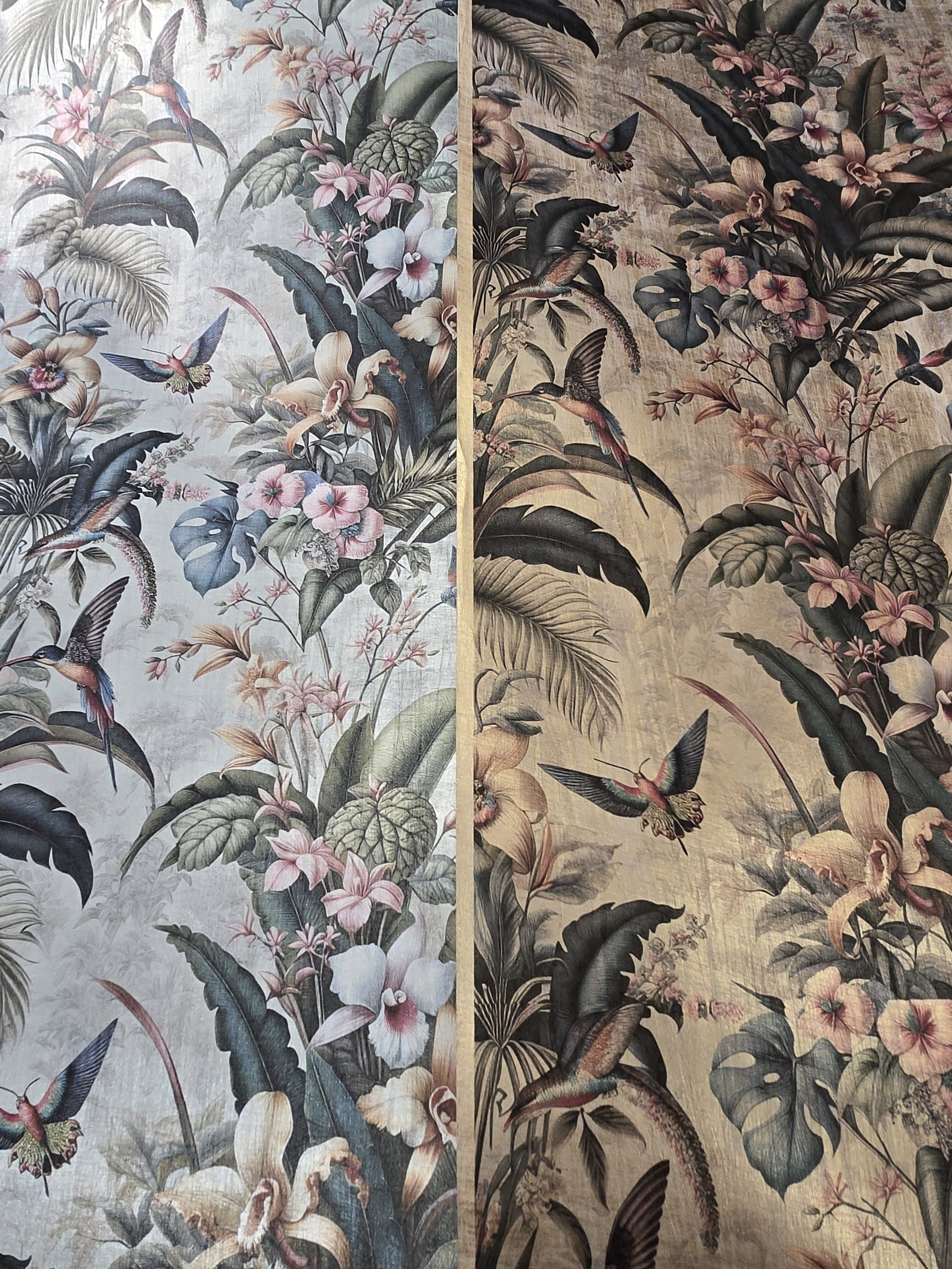 Singapura a stunning and intricate wallpaper designed for our tropical lovers. Sit back and smell the orchids and feel the soft flutter if wings as the tropical birds glide past you. We just love how the gold catches the light and sparkles in the sun.