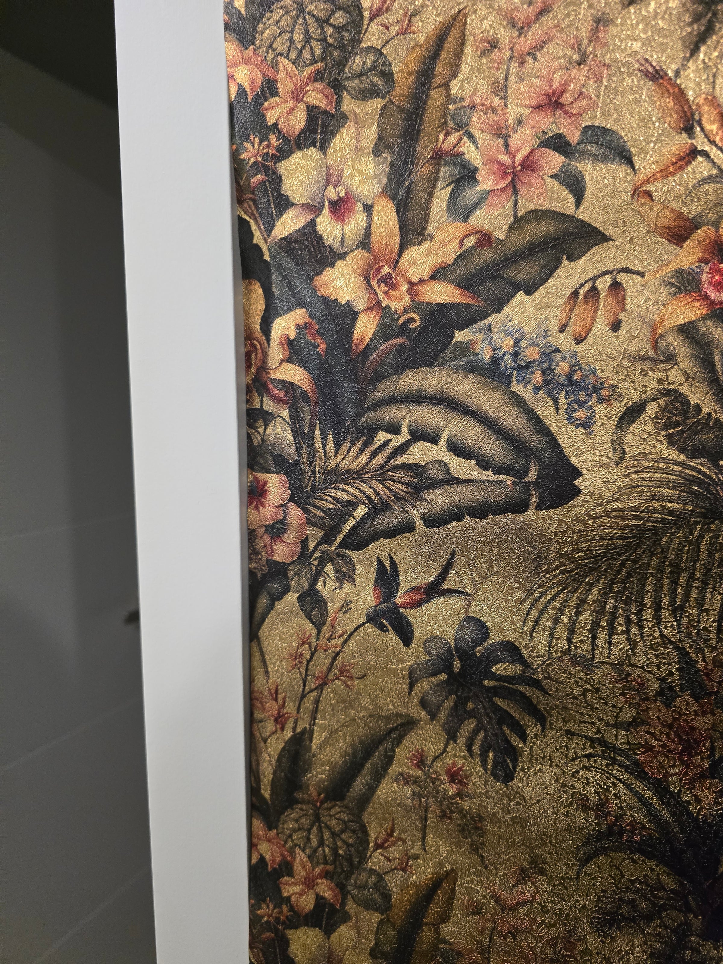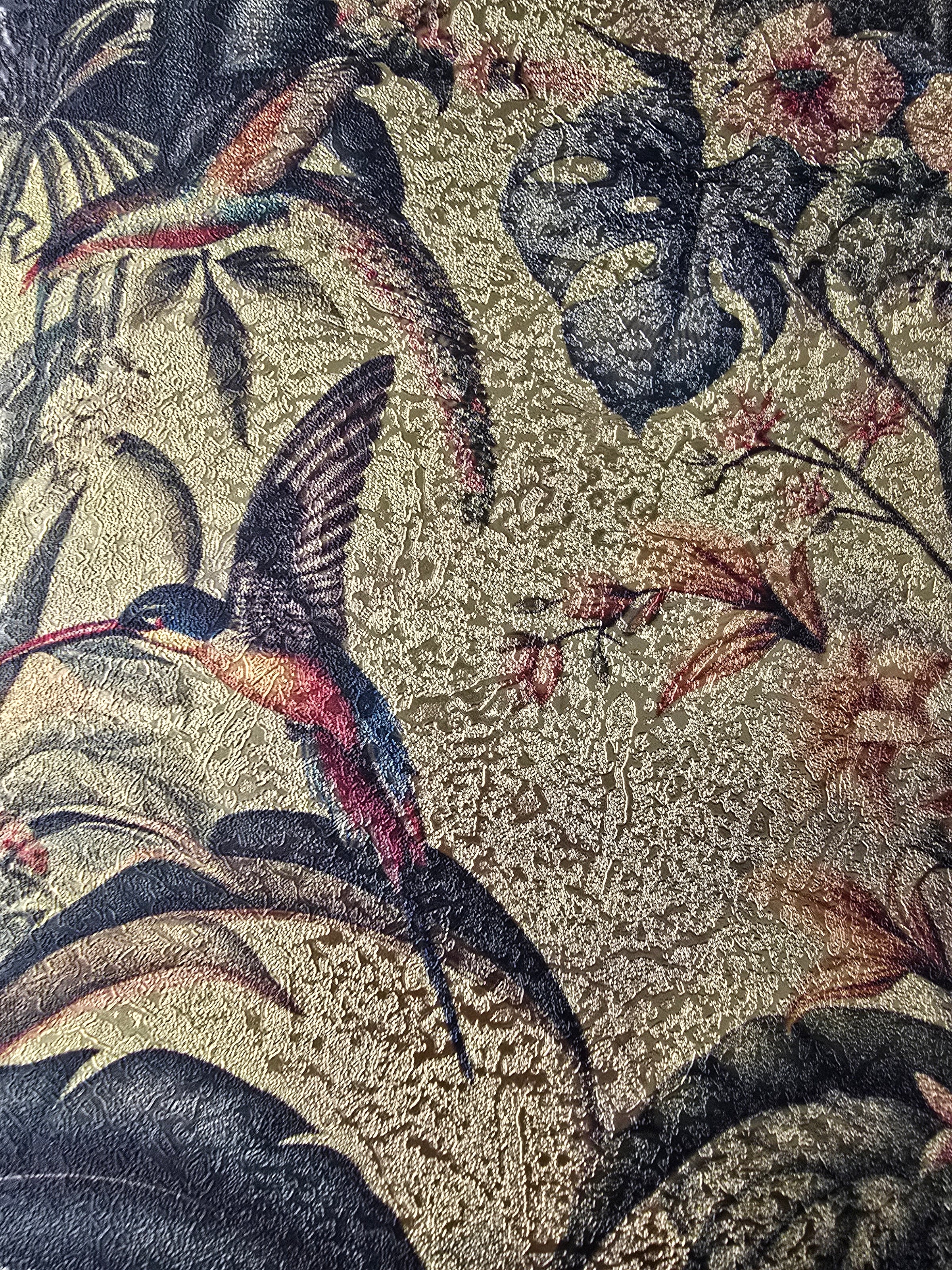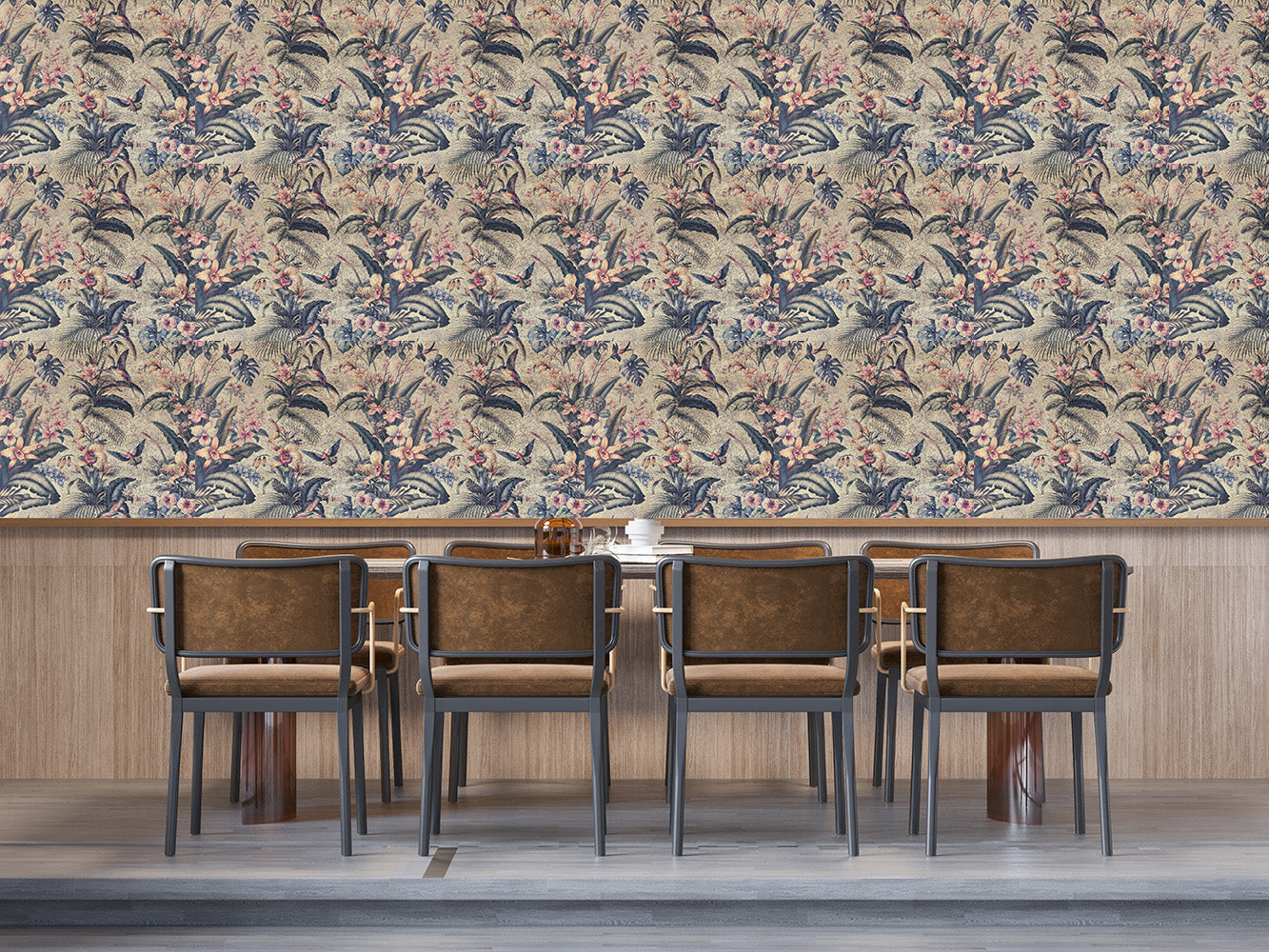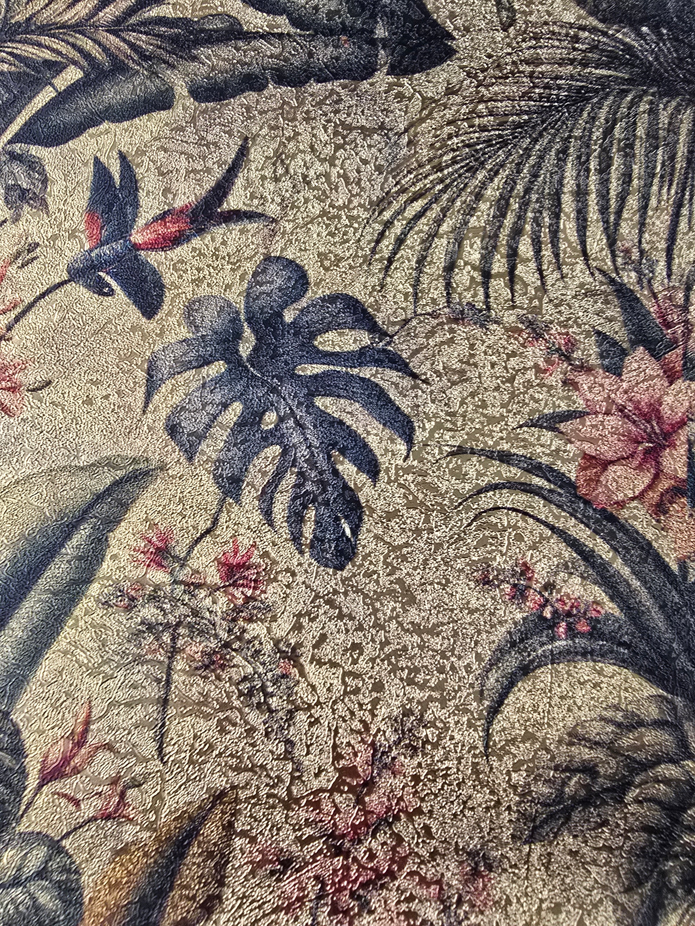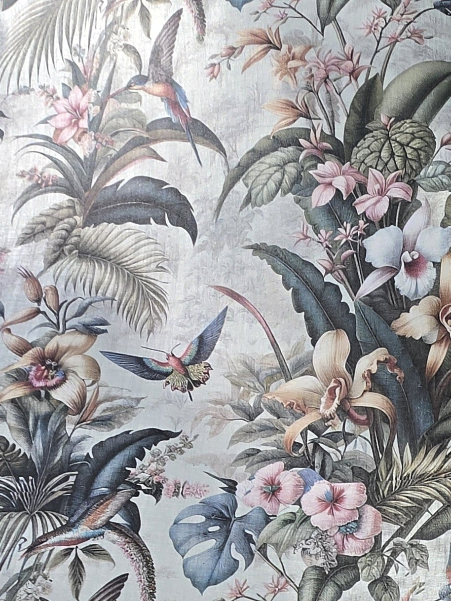 Singapura a stunning and intricate wallpaper designed for our tropical lovers. Sit back and smell the orchids and feel the soft flutter if wings as the tropical birds glide past you. We just love how the gold catches the light and sparkles in the sun.