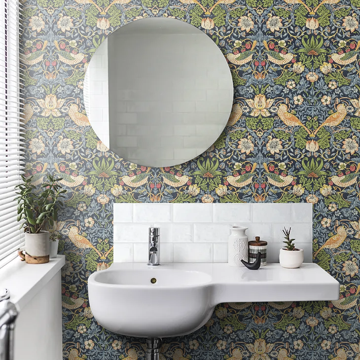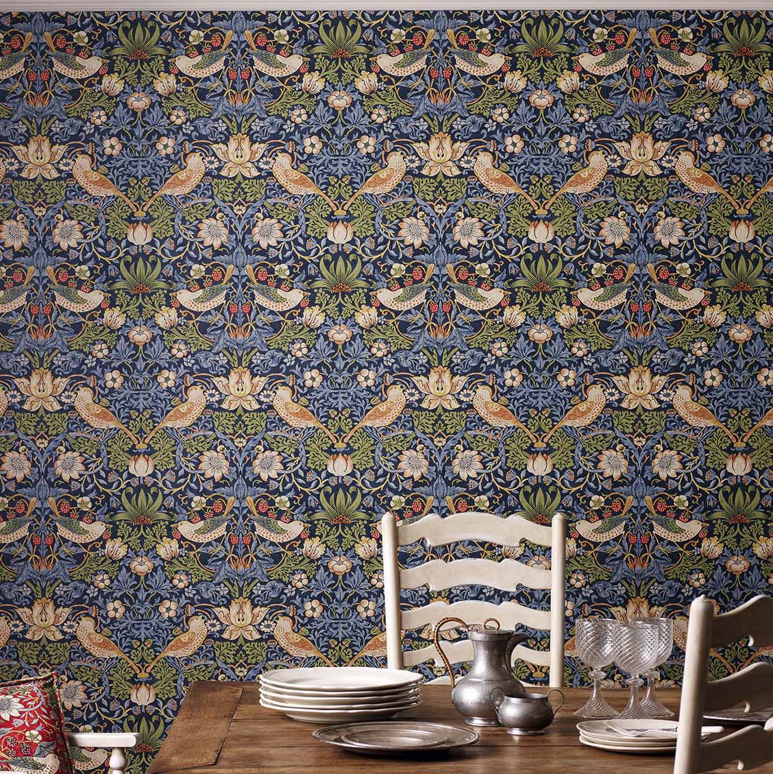 Strawberry Thief Wallpaper by William Morris is a classic illustration of fine style never going out of date. Originally designed in 1879, Morris & Co.'s famed Strawberry Thief pattern boasts swirling botanicals and thieving thrushes in a visually opulent scene.