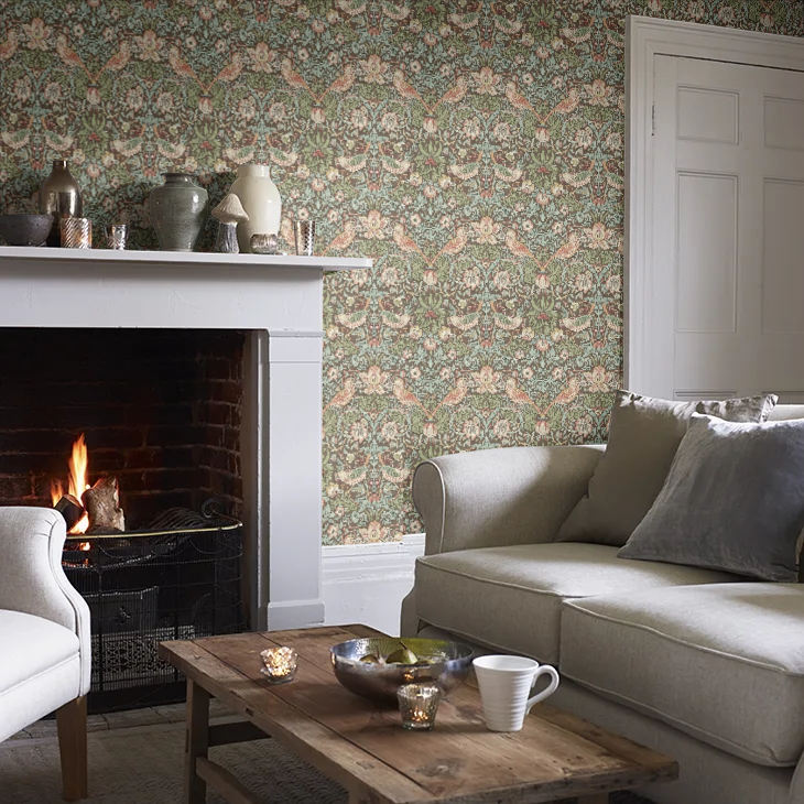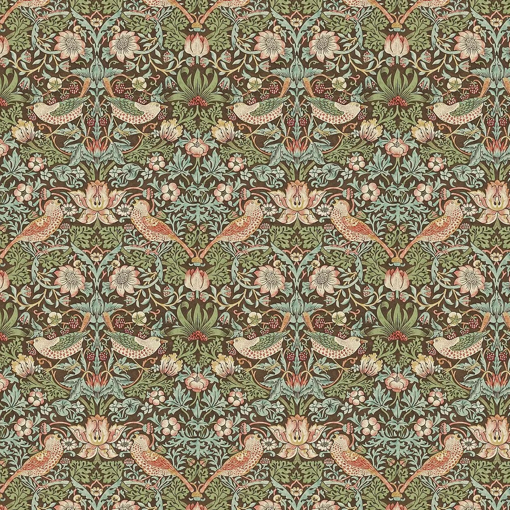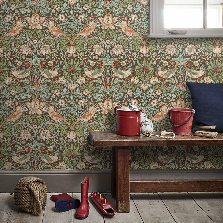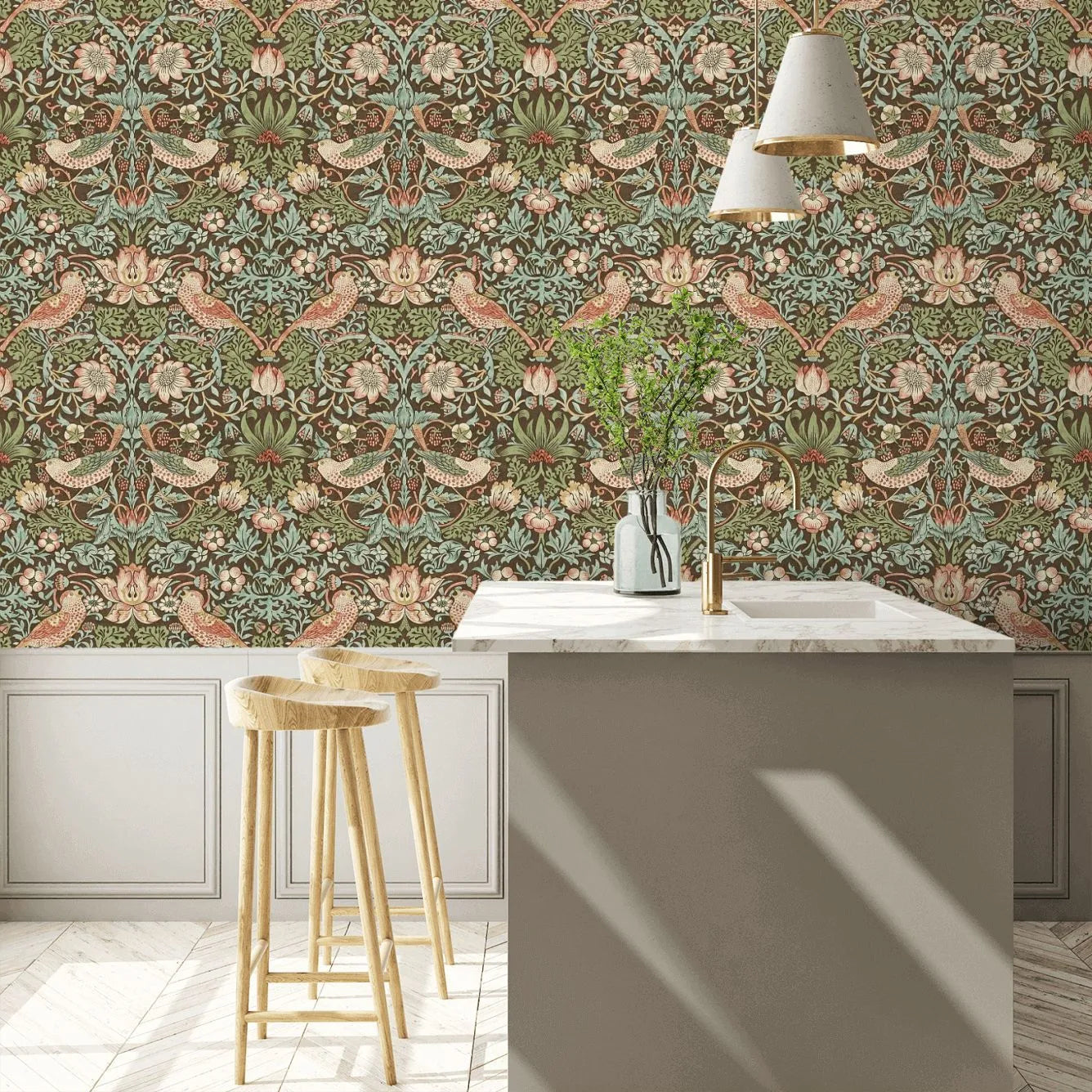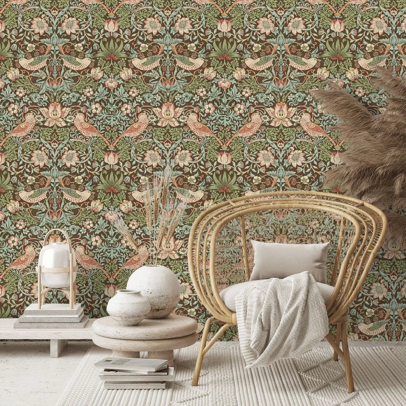 Strawberry Thief Wallpaper by William Morris is a classic illustration of fine style never going out of date. Originally designed in 1879, Morris & Co.'s famed Strawberry Thief pattern boasts swirling botanicals and thieving thrushes in a visually opulent scene.