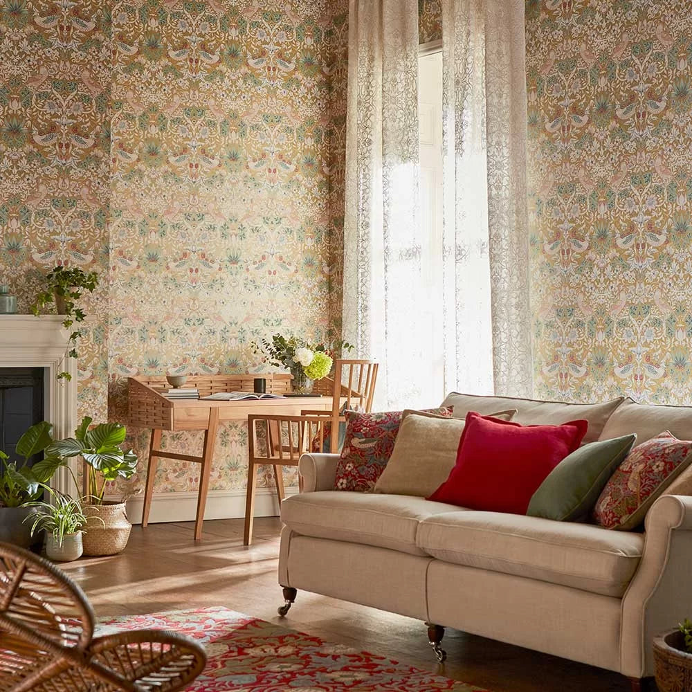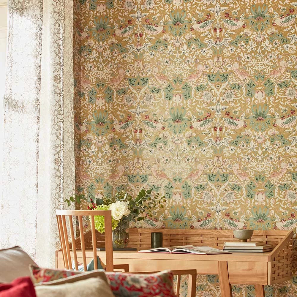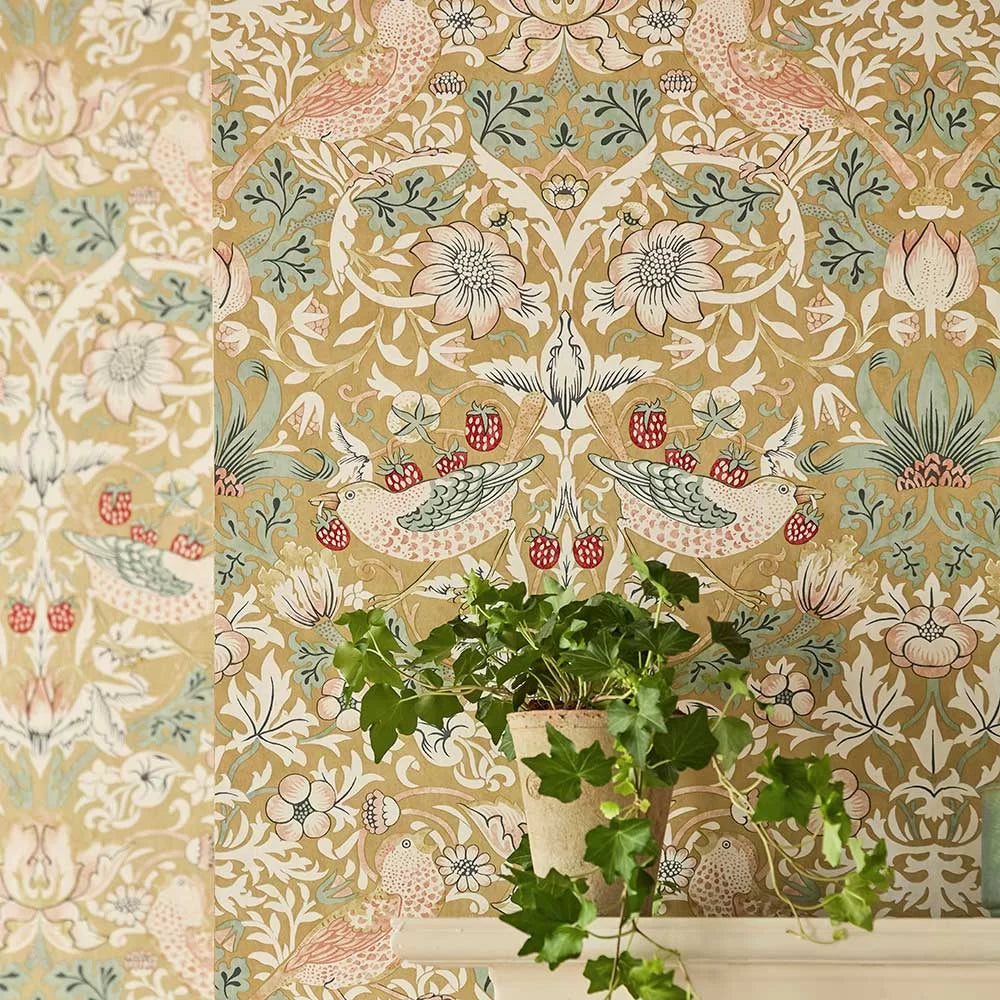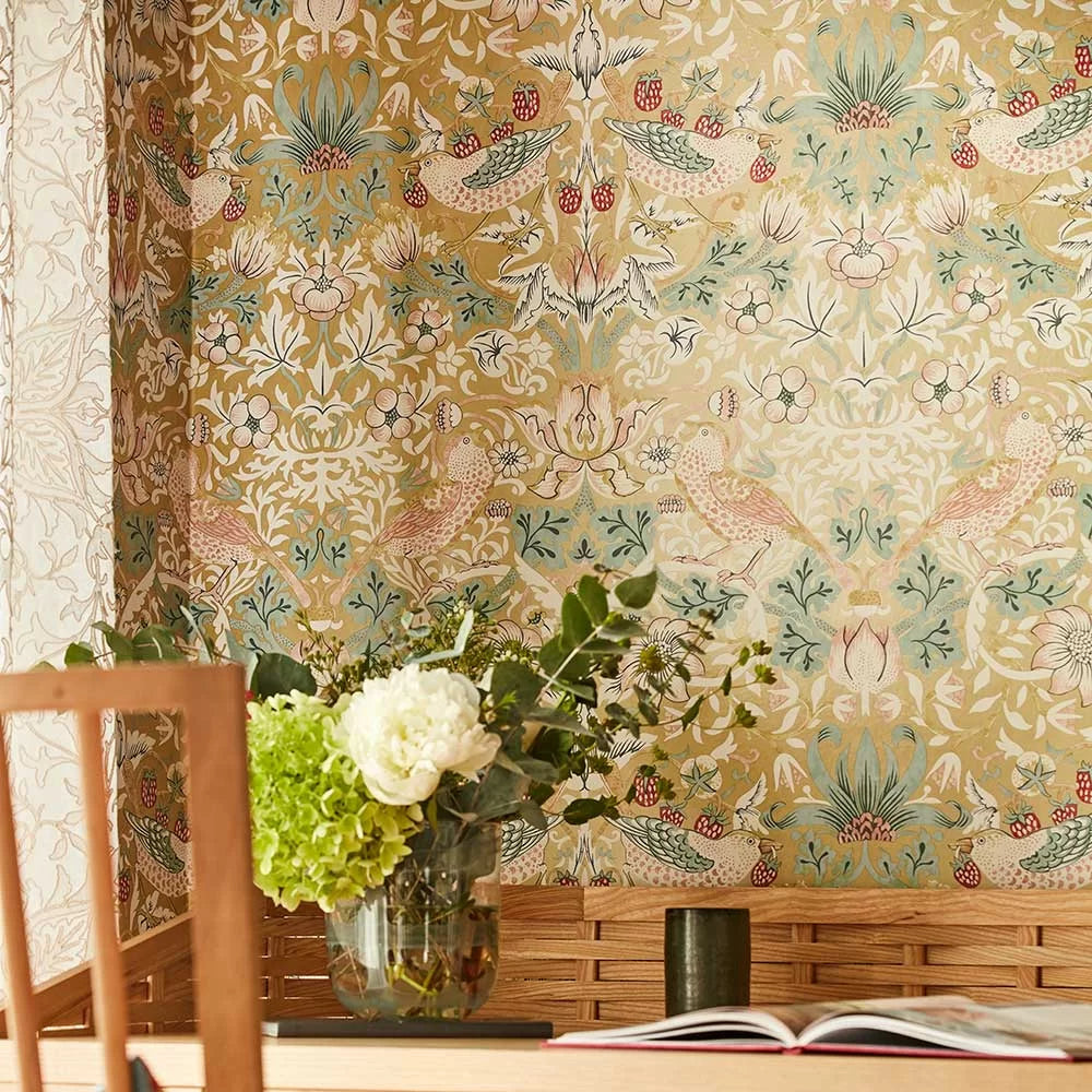 Strawberry Thief Wallpaper by William Morris is a classic illustration of fine style never going out of date. Originally designed in 1879, Morris & Co.'s famed Strawberry Thief pattern boasts swirling botanicals and thieving thrushes in a visually opulent scene.