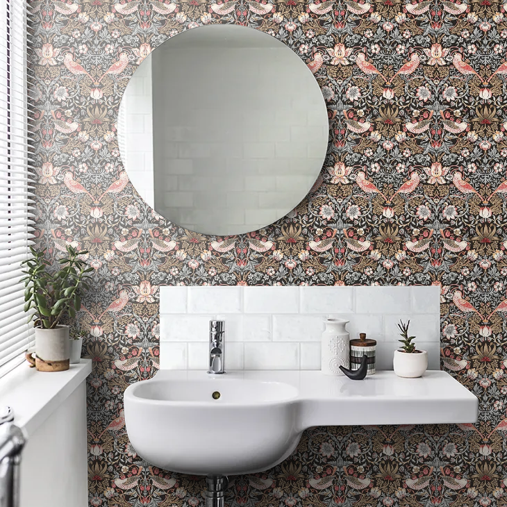 Strawberry Thief Wallpaper by William Morris is a classic illustration of fine style never going out of date. Originally designed in 1879, Morris & Co.'s famed Strawberry Thief pattern boasts swirling botanicals and thieving thrushes in a visually opulent scene.