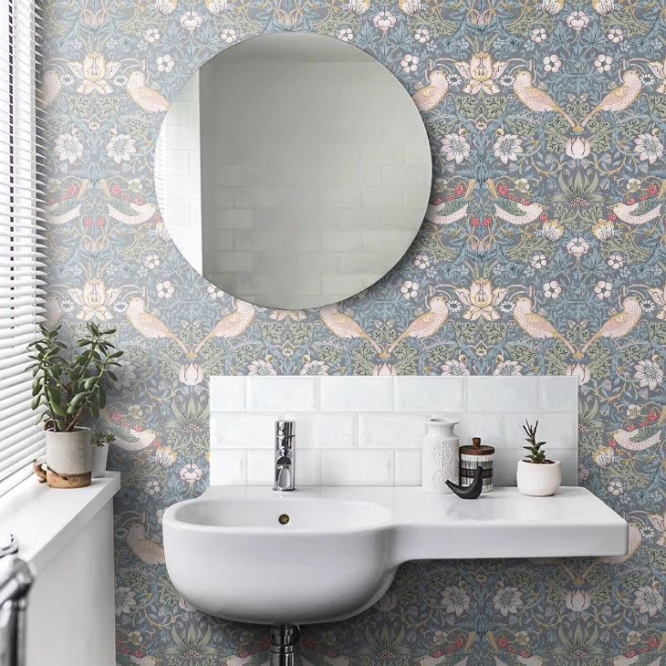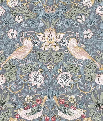 Strawberry Thief Wallpaper by William Morris is a classic illustration of fine style never going out of date. Originally designed in 1879, Morris & Co.'s famed Strawberry Thief pattern boasts swirling botanicals and thieving thrushes in a visually opulent scene.