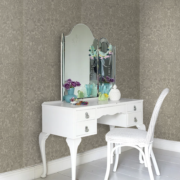 Sunflower Wallpaper by William Morris is a classic illustration of fine style that never goes out of date. 'Compton' was designed by John Henry Dearle in 1895 specially for Compton Hall in Wolverhampton. The original design required two sets of wood blocks to print all 28 colours, owing to the large vertical repeating pattern but has since been scaled down and adapted for a wider audience. This wallpaper that has been kicking around for well over a hundred years now is still a style icon.