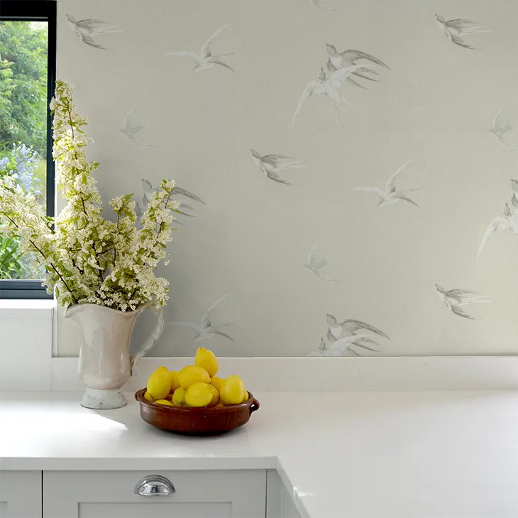 From the Vintage Collection of wallpapers comes 'Swallows' the wallpaper. Featuring delicately drawn birds soaring through a summer sky. The 'Swallows' wallpaper was originally a cotton chintz fabric that has been updated to be a wallpaper. This serene design featuring a beautiful hand painted swallow design, dates back to the 1930s and exemplifies the stylised elegance associated with this era. Available in 5 great colours, Swallows is elegant, timeless and simply stunning.