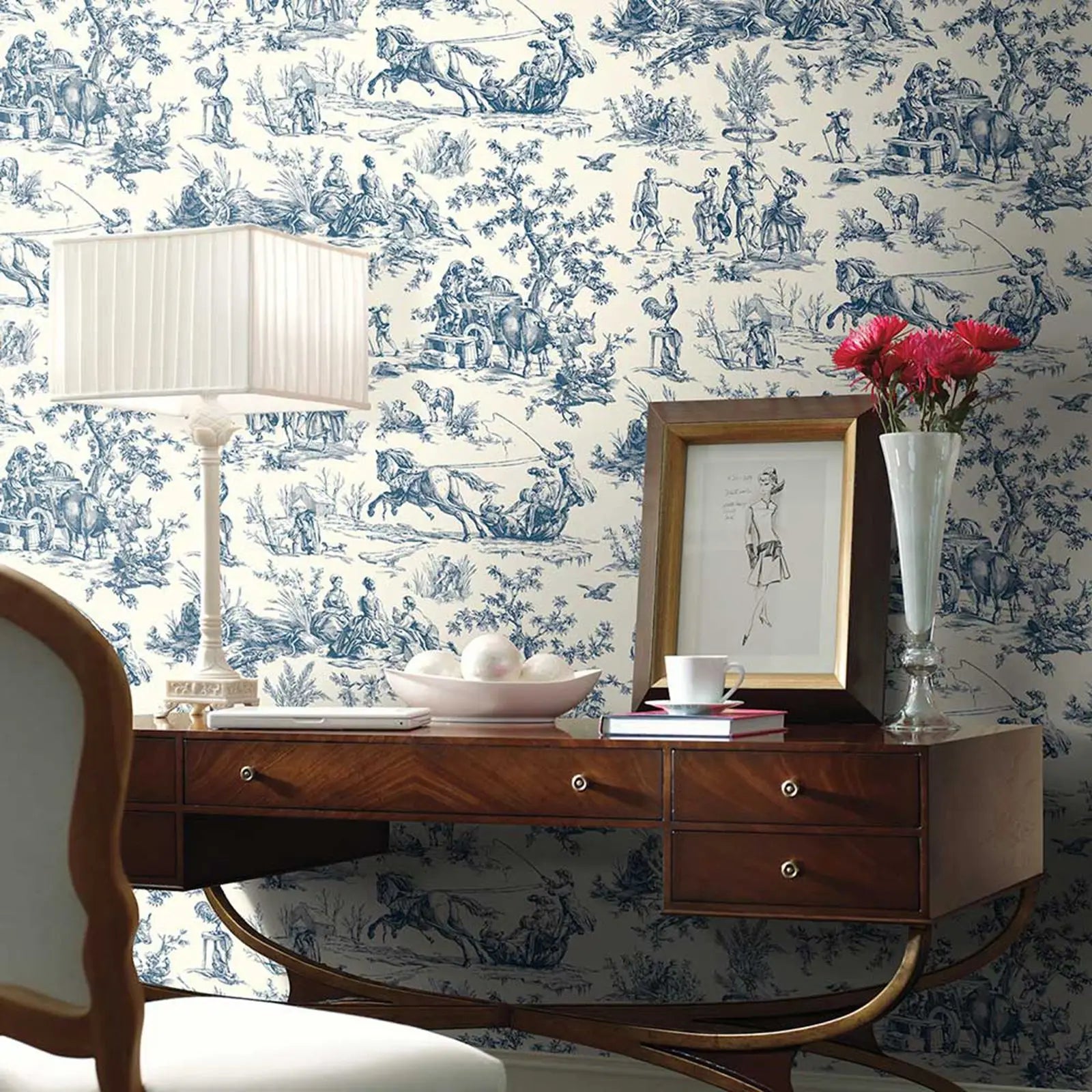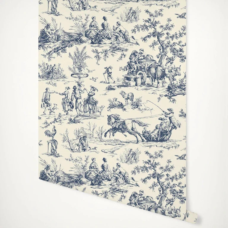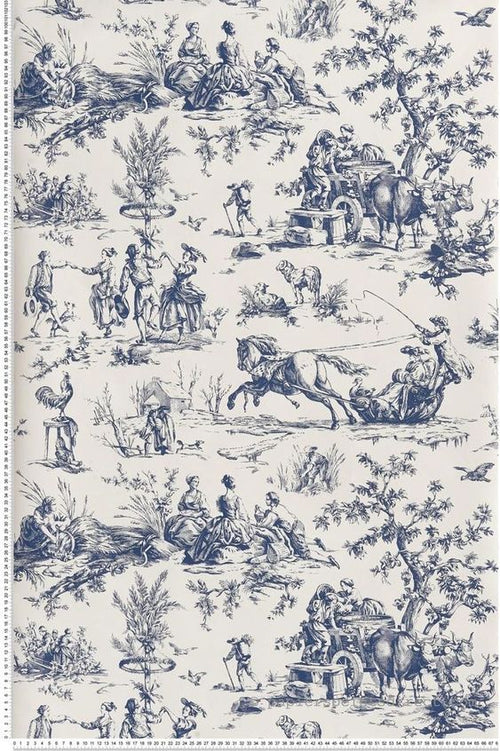 Vintage Toile Wallpaper - Cream/Navy