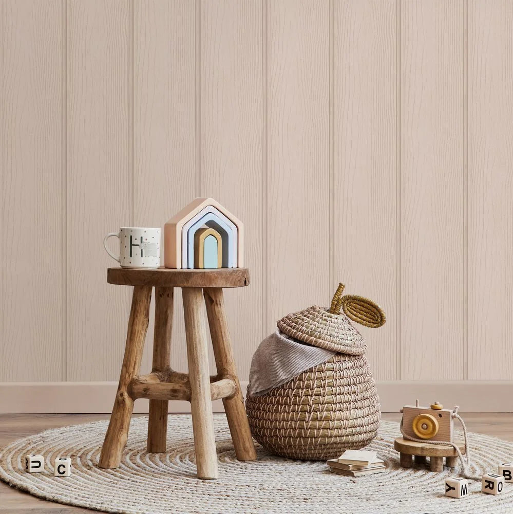 A wood panel wallpaper creating a sense of character and charm to any space. With its subtle texture and soft, painted finish, this design is ideal for choice for your home.