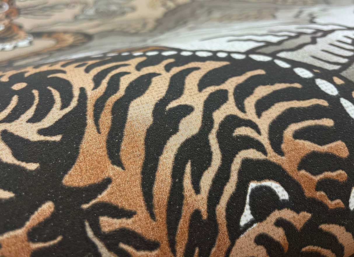 Tora the Tiger wallpaper is from our Khalilli collection and is inspired by Chinese culture. Symbolising bravery and strength, the tiger in the pattern has textured, sparkling detailed areas. Ornate scroll patterns lace the central mountain range which creates an Ombre focal point framed by the powerful tiger. A canvas texture runs throughout the design giving a more delicate fabric appearance. This design is completely PVC-Free.