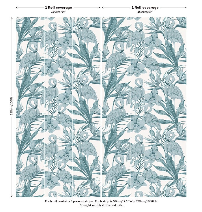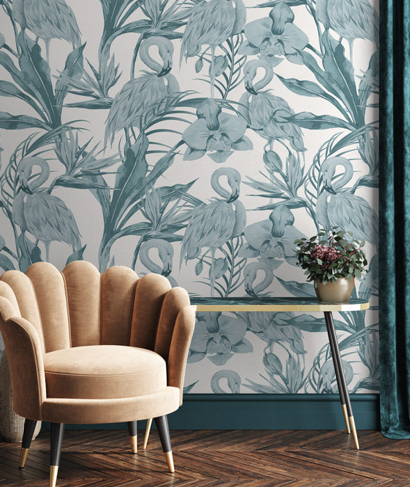 This tropical flamingo wallpaper fits a variety of environments through its intersection of contemporary and vintage design. The Tropical Shore (Tropical Flamingo) wallpaper features a flock of flamingos painted with water colours near a variety of tropical plants and hibiscus flowers.
