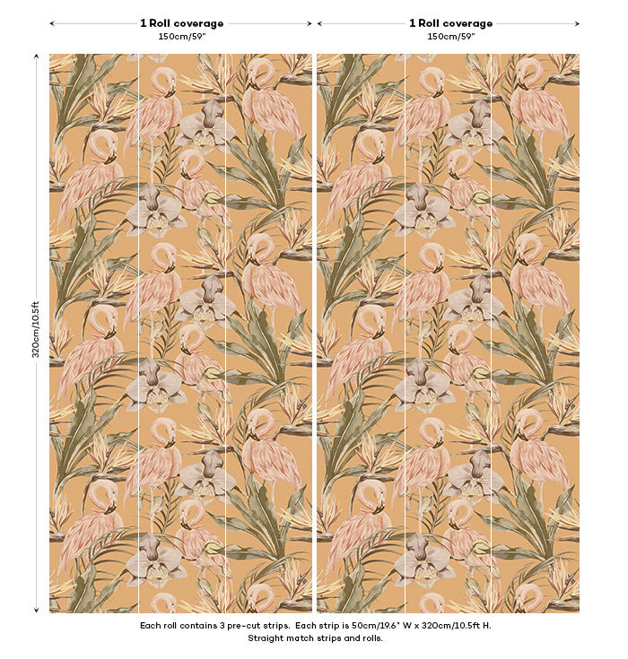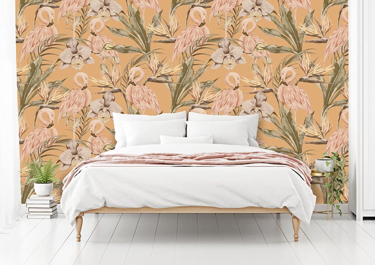 This tropical flamingo wallpaper fits a variety of environments through its intersection of contemporary and vintage design. The Tropical Shore (Tropical Flamingo) wallpaper features a flock of flamingos painted with water colours near a variety of tropical plants and hibiscus flowers.