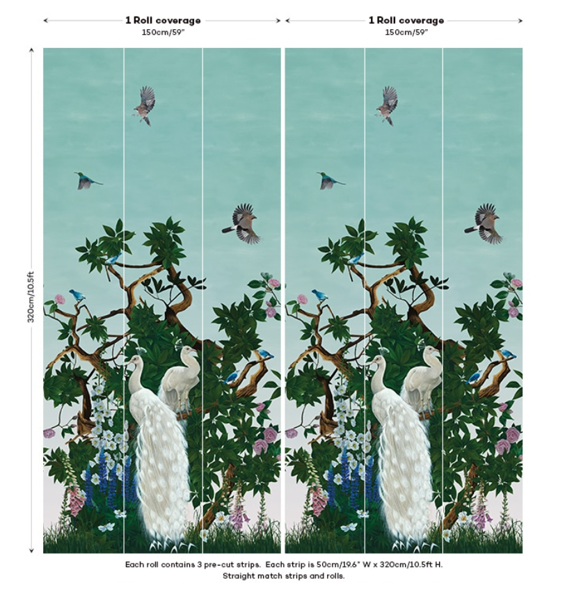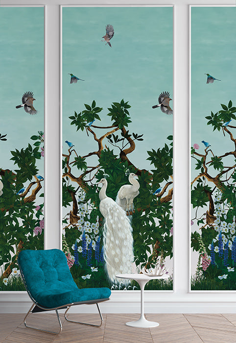 Discover Vera’s Garden in Jade, created by artist Joanna Charlotte. This chinoiserie peacock wallpaper is truly a work of art, featuring stunning peacocks, flora and fauna set against a duck egg blue wallpaper background. Richly detailed plants climb up the wallpaper, amongst which are perched beautifully imagined peacocks, their feathers captured in stunning detail. Imagine this Japanese style wallpaper as romantic bedroom wallpaper, a dramatic living room wallpaper or a stately dining room wallpaper. The beauty of this unique wallpaper is perfect for adding a touch of luxury to any room in your home.