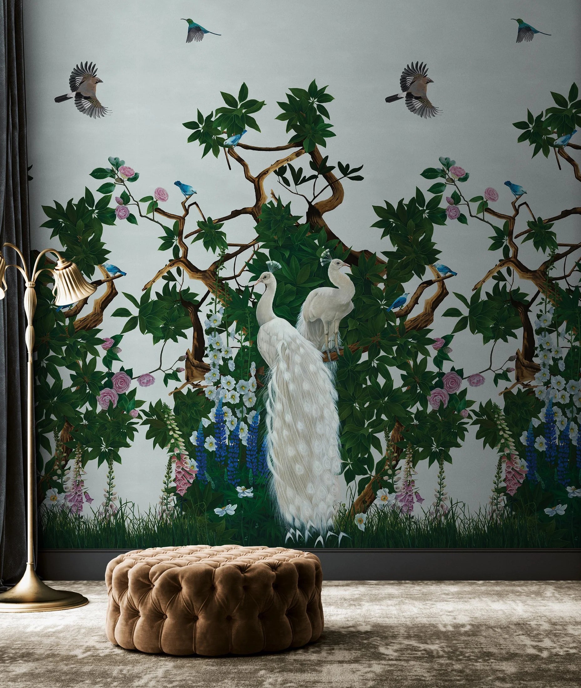 Discover Vera’s Garden in Jade, created by artist Joanna Charlotte. This chinoiserie peacock wallpaper is truly a work of art, featuring stunning peacocks, flora and fauna set against a duck egg blue wallpaper background. Richly detailed plants climb up the wallpaper, amongst which are perched beautifully imagined peacocks, their feathers captured in stunning detail. Imagine this Japanese style wallpaper as romantic bedroom wallpaper, a dramatic living room wallpaper or a stately dining room wallpaper. The beauty of this unique wallpaper is perfect for adding a touch of luxury to any room in your home.