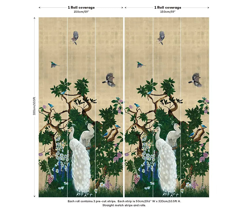 Discover Vera’s Garden in Jade, created by artist Joanna Charlotte. This chinoiserie peacock wallpaper is truly a work of art, featuring stunning peacocks, flora and fauna set against a pale mustard wallpaper background. Richly detailed plants climb up the wallpaper, amongst which are perched beautifully imagined peacocks, their feathers captured in stunning detail. Imagine this Japanese style wallpaper as romantic bedroom wallpaper, a dramatic living room wallpaper or a stately dining room wallpaper. The beauty of this unique wallpaper is perfect for adding a touch of luxury to any room in your home.