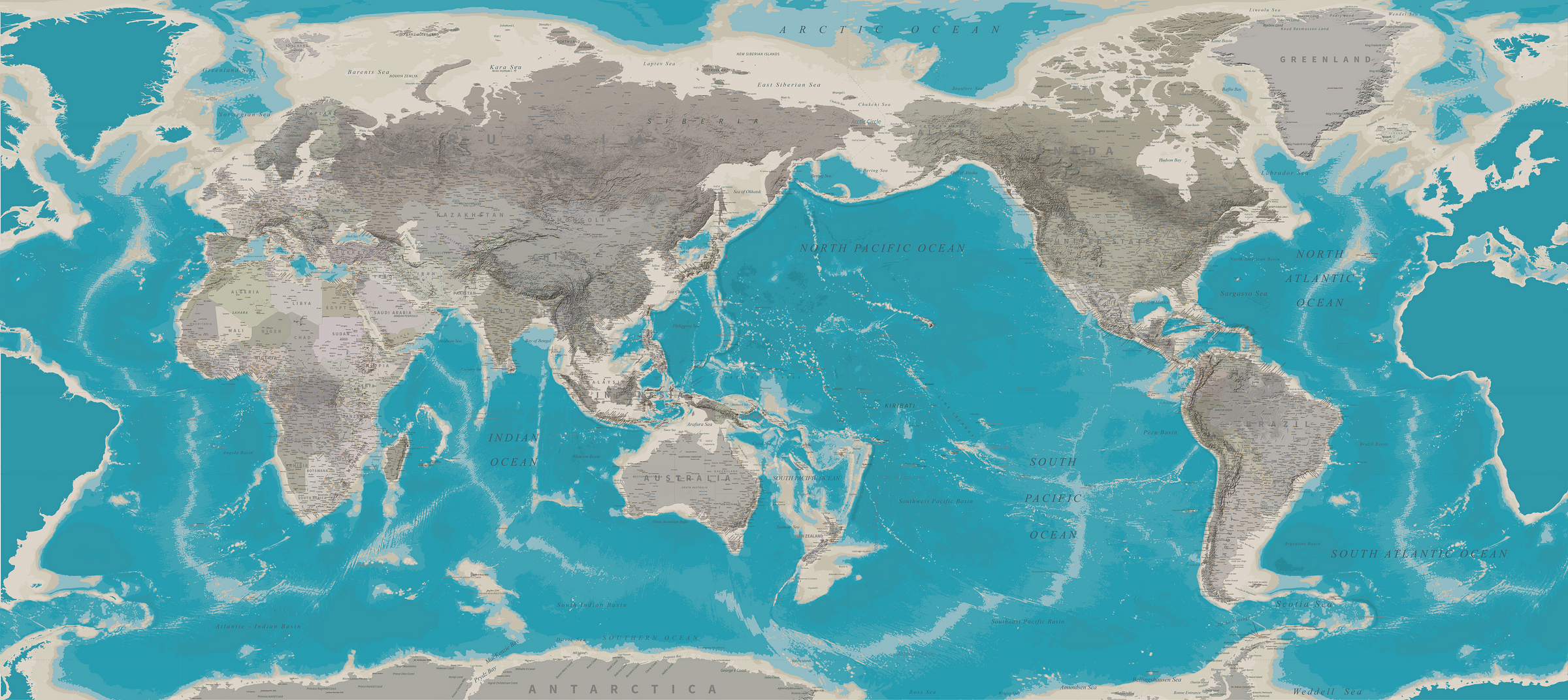 World Map NZ Centered - Blue/Grey - Custom Sized Wallpaper Mural
