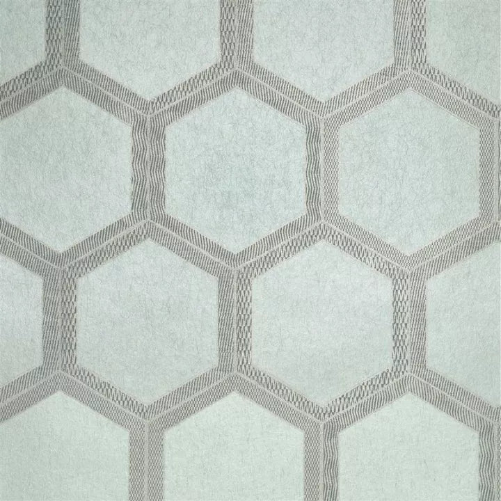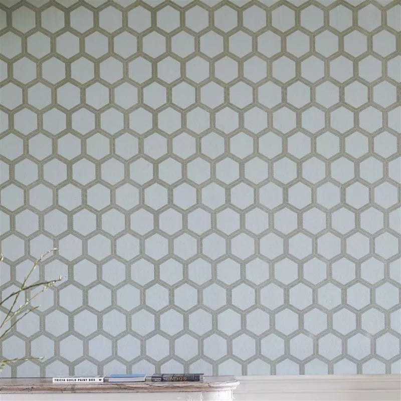 This large scale wallpaper design utilises hexagonal shape and linear print to sophisticated and glamorous effect. With a subtle metallic effect, this stylish graphic wallpaper design is flexo printed onto a gently textured nonwoven ground for ease of hanging in any interior setting.